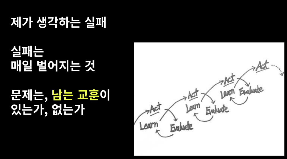그랬기 때문에, 어느 순간부터는 실패를 하는 건 원래 기본값인데 그렇다면 여기에서 무슨 깨달음을 얻어서 이 다음에는 다르게 해 볼 것인가? 라는 것에 제 머리는 좀 더 초점이 맞춰지게 되었습니다. 아래 사진은 어제 북토크에서 보여드린 자료 중 일부입니다.
