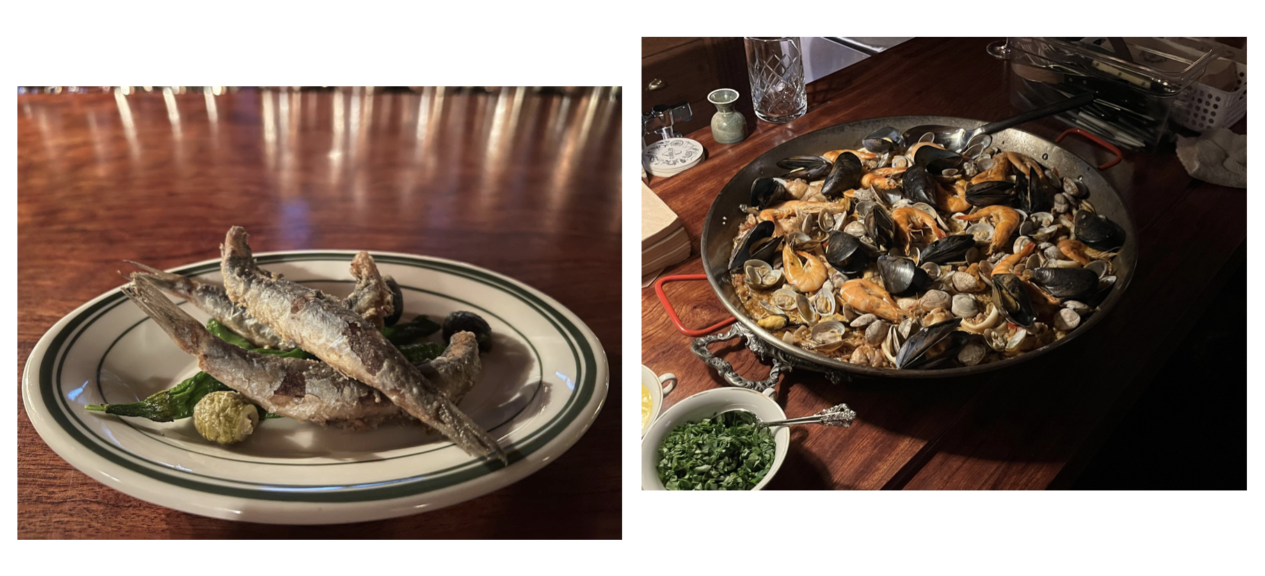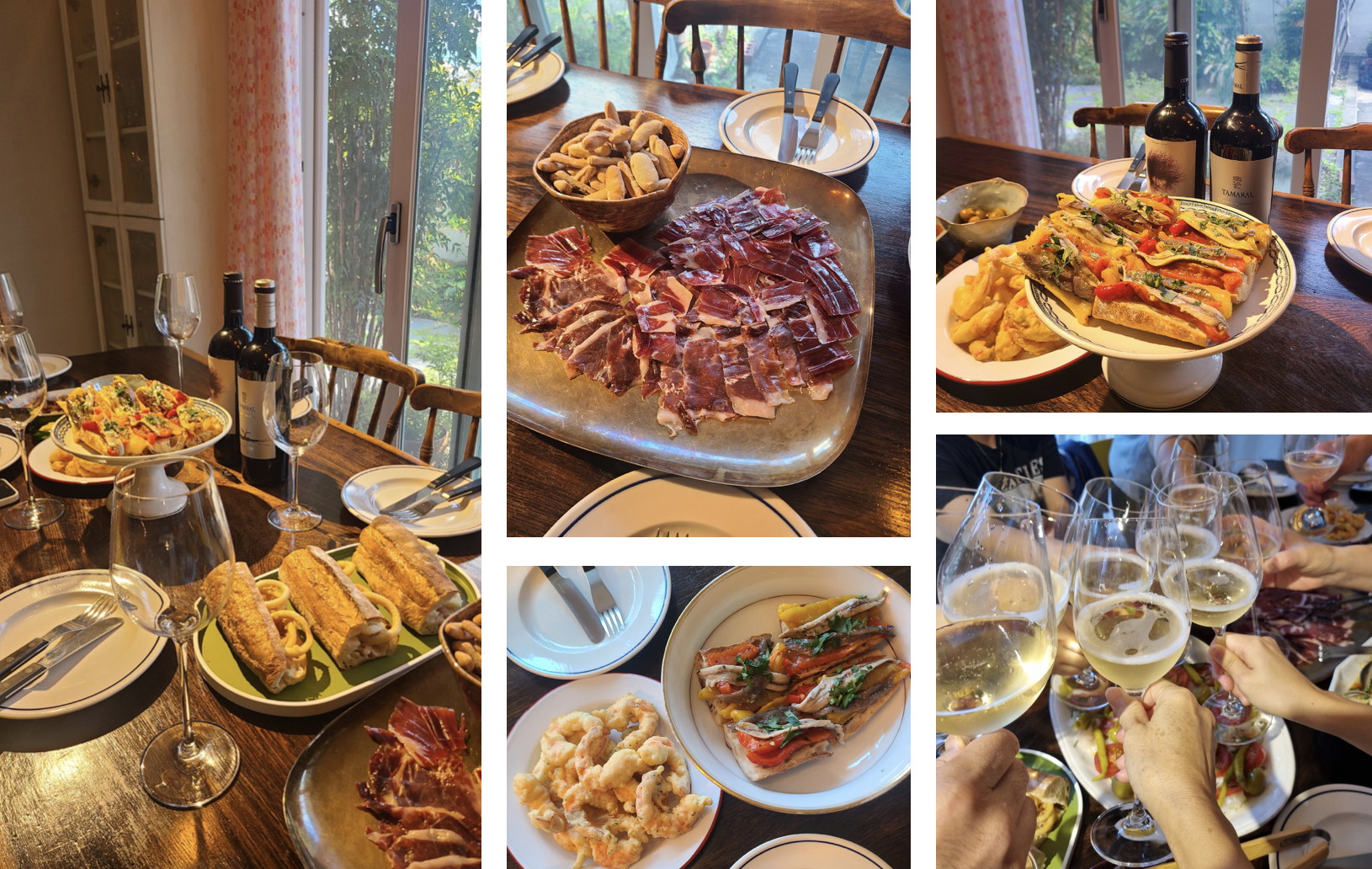 'Casa Dani' 스타일의 토르티야 에스파뇨라 / 하몽 베료타와 건빵 가을 여러가지 버섯 볶음 타파스 / 간바스 레보사도스와 알리오리 소스 / 모시조개와 초리조 볶음 / Anchoa Salazon(구운 파프리카 위에 얹은 멸치 식초절임과 소금 절임 앤초비) / 바카라오와 토마토 샐러드 / 보카디료 데 카라마레스(오징어 튀김 샌드위치) |