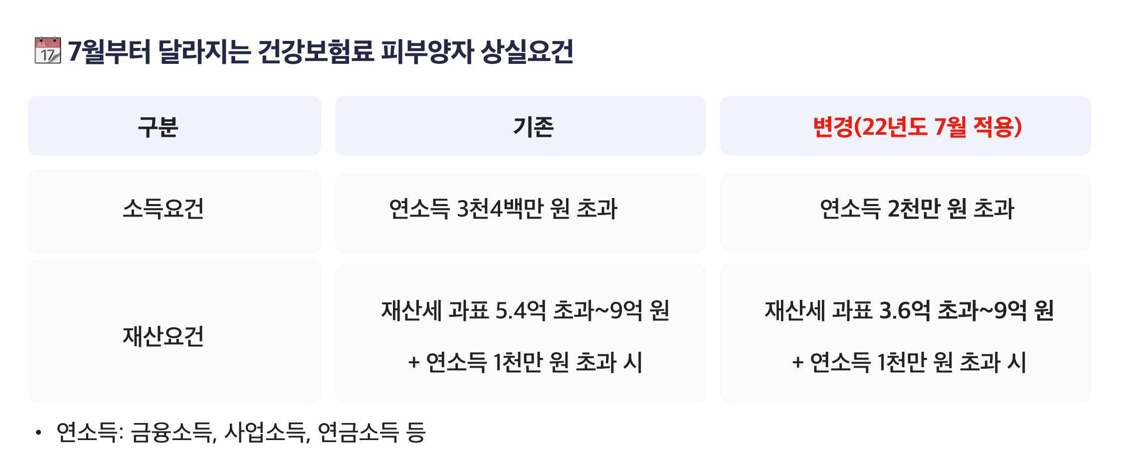 ) λ±μ΄ ν¬ν¨λ©λλ€. νΌλΆμμλ€μ μλμ건과 μ¬μ°μ건μ λ§μ‘±ν΄μΌ νΌλΆμμλ‘μ λ³λμ 건κ°λ³΄νλ£ λ©λΆ μμ΄ κ±΄κ°λ³΄ν ννμ μ μ©λ°μ μ μμ΅λλ€.