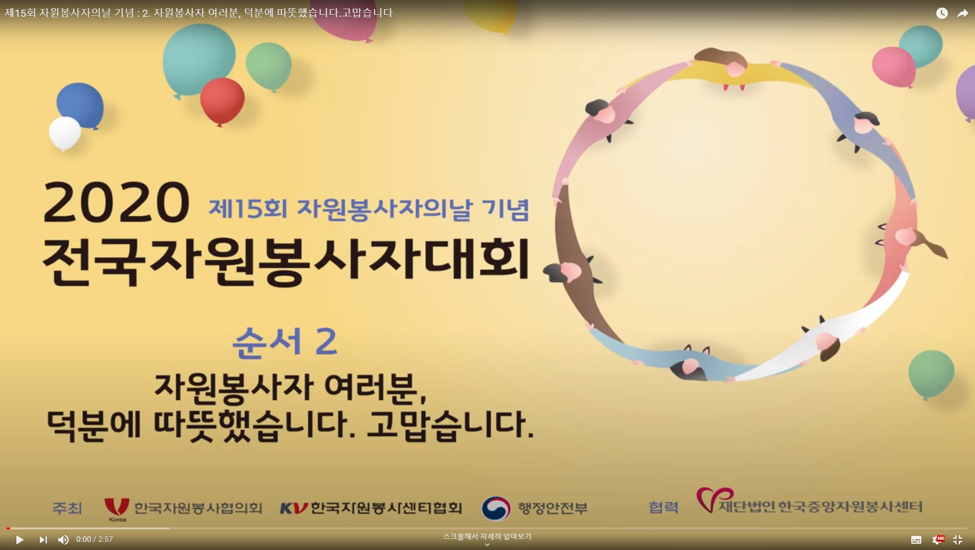 ![]() [2020 제15회 전국자원봉사자대회 고맙습니다 릴레이 영상 ] 제 15회 전국자원봉사자대회를 기념하여 2020년 한 해 동안 각 기관이 자원봉사활동으로 더 나은 사회로의 변화에 기여한 자원봉사자들에게 감사함을 표현하기 위해 제작한 릴레이 고맙습니다 영상입니다. ▶ 고맙습니다 영상 보러가기 ☜ 클릭! ![]() [비대면 자원봉사 프로그램 설문결과] - 제출내용 : 비대면 자원봉사 프로그램 (사업명, 성과 및 사회변화, 협업기관 등) - 제출대상 : 전국 246개 자원봉사센터 - 설문기한 : 2020. 10. 19 ~ 10. 30