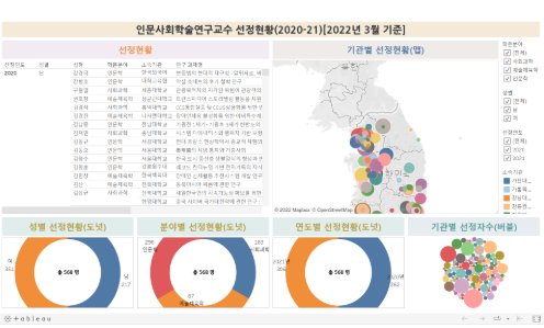 성과확산센터 홈페이지에서는 Table, Google Maps, Tableau를 이용해 인문사회학술연구교수(A유형)의 선정현황 데이터를 시각화하여 서비스하고 있습니다. 특히 Tableau 플랫폼의 대시보드에서는 학문분야, 성별, 선정연도, 소속기관에 따른 정보를 직관적으로 표현하여 이용자에게 제공하고 있습니다. 향후 연구성과가 지속적으로 축적된다면, 학술연구교수의 학술지 인용 영향력 지수 분석, 거시적 연구지형 분석 , 개인적인 연구역량과 위상 진단, 연구 방향성 수립 등에 활용할 수 있을 것으로 기대됩니다.