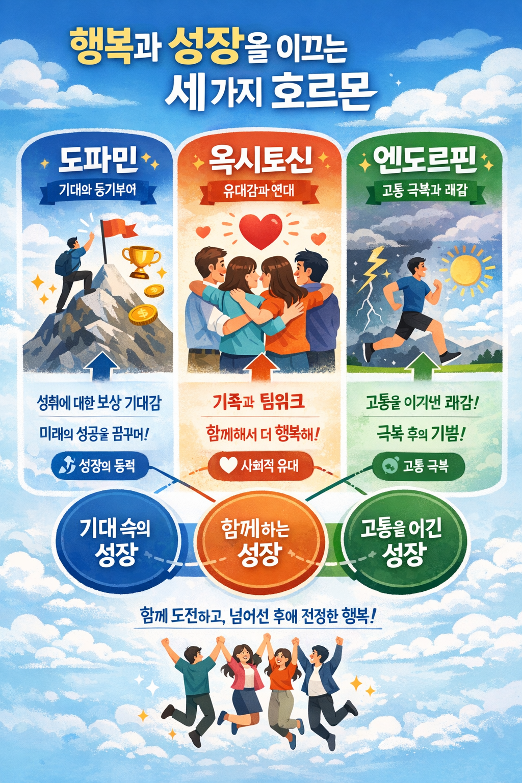 자녀를 키운다는 것은 반복적인 행복 호르몬의 연속입니다. 아이의 성장을 지켜볼 때 정말 무한한 행복을 느낍니다. 아이의 성장을 기대하면서 꿈에 젖을 때가 많습니다(도파민). 하지만 좌절하는 경우가 오히려 더 많습니다. 아이는 제 마음대로 되지 않고, 기대에 못미칠 때가 많죠. 하지만 그런 고통에도 불구하고 아이가 진정한 의미로 성장했을 때 고통은 잊혀집니다 (엔도르핀). 아이의 성장을 위해 부모가 헌신하고 희생하는 이유입니다. 누군가의 성장을 지켜보고 응원하는 것은 때로는 나의 성장보다 더 의미가 있습니다.