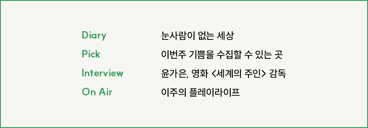 새해를 맞은 지 얼마되지 않은 1월, 전국에는 흰 눈이 펑펑 내렸어요. 직장인인 에디터는 퇴근길과 다음날 출근길을 걱정하며 창밖을 바라보고 있었어요. 눈송이가 굵어서 길에 제법 쌓인 상태였거든요. 어느새 제 시야에 패딩 모자를 덮어쓰고 장갑을 낀 아이들 셋이 쪼르르 들어왔어요. 아이들은 망설임 없이 작은 눈덩이를 굴리기 시작했고, 저는 그 눈덩이가 눈사람이 되는 과정을 끝까지 지켜봤어요. 아이들의 모자와 어깨 위에도 눈이 소복하게 내려앉아 마치 눈사람 넷이 거기 있는 듯했죠. 눈사람 제작 현장을 라이브(?)로 감상하며 그런 생각이 들었어요. ‘낭만이 없는 세상은 얼마나 재미없는가’. 다음날 출근길, 곳곳에서 낭만의 흔적을 발견할 때마다 감사한 마음을 눈에 담았어요. 이 세계에 낭만이 사라지지 않게 해줘서, 고마워!