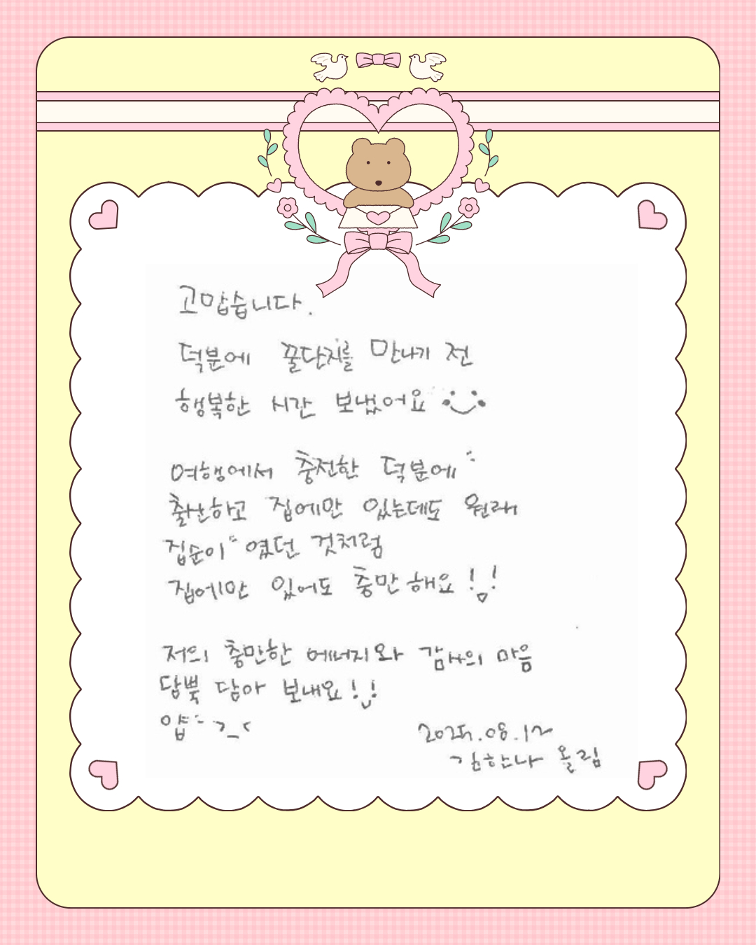 얼마 전, 재충전 지원사업에 참여하신 한 활동가분으로부터 따뜻한 편지를 받았습니다. 재충전 지원 사업을 통해 출산 전에 꿀단지(태명)와 함께 행복한 시간을 보내고 에너지를 충전할 수 있었다는 김한나 님의 편지를 읽으며, 저희 동행도 함께 충전되는 기분이었습니다.