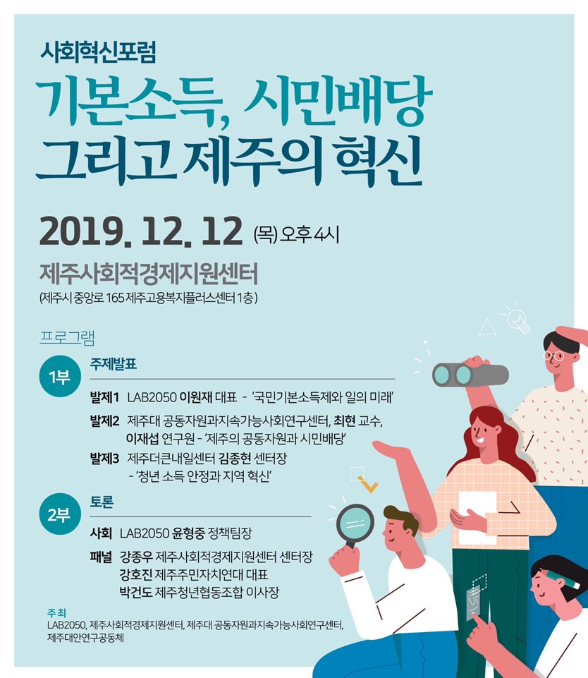 제주에서 여는 사회혁신포럼 '기본소득, 시민배당 그리고 제주의 혁신' 12월 12일(목) 오후 4시 @제주사회적경제지원센터 안녕하세요. LAB2050입니다. 어느덧 12월입니다. 쌀쌀해지는 날씨에 건강 유의하시기 바랍니다. LAB2050이 12월 12일에 제주에서 사회혁신포럼을 개최합니다. 제주에서 이미 혁신적인 연구와 활동을 하고 계신 분들과 함께 기획하고 주최하는 행사입니다. 당일에 제주에 계시고, 시간이 되시는 누구든 참석을 환영합니다. 이번 사회혁신 포럼에는 세 가지 발제가 준비되어 있습니다. 이원재 LAB2050 대표가 '국민기본소득제와 일의 미래'라는 주제로 발표를 할 예정입니다. 기본소득 논의의 현황과 우리의 일이 어떤 식으로 변모할지를 예측해보며 제주에서 혁신의 가능성을 모색해보려 합니다. 제주대 공동자원과지속가능사회연구센터에선 이재섭 연구원이 '제주의 공동자원과 시민배당'이란 주제로 발제를 합니다. 제주에서 적용 가능한 구체적인 사회혁신 방안에 대한 논의가 이어질 것이라 기대됩니다. 세 번째 발표는 이미 실행되고 있는 혁신 정책에 관한 내용입니다. 지난해 10월부터 청년들에게 월150만원씩 2년간 지급하며 혁신의 산실을 지향하는 제주 더큰내일센터의 김종현 센터장이 '청년 소득 안정과 지역 혁신'이란 주제로 발표를 합니다. 이번 행사는 제주사회적경제지원센터, 제주대 공동자원과지속가능사회연구센터, 제주대안연구공동체와 공동 주최합니다. 관심 있는 분들의 참여 바랍니다. 감사합니다. LAB2050 드림