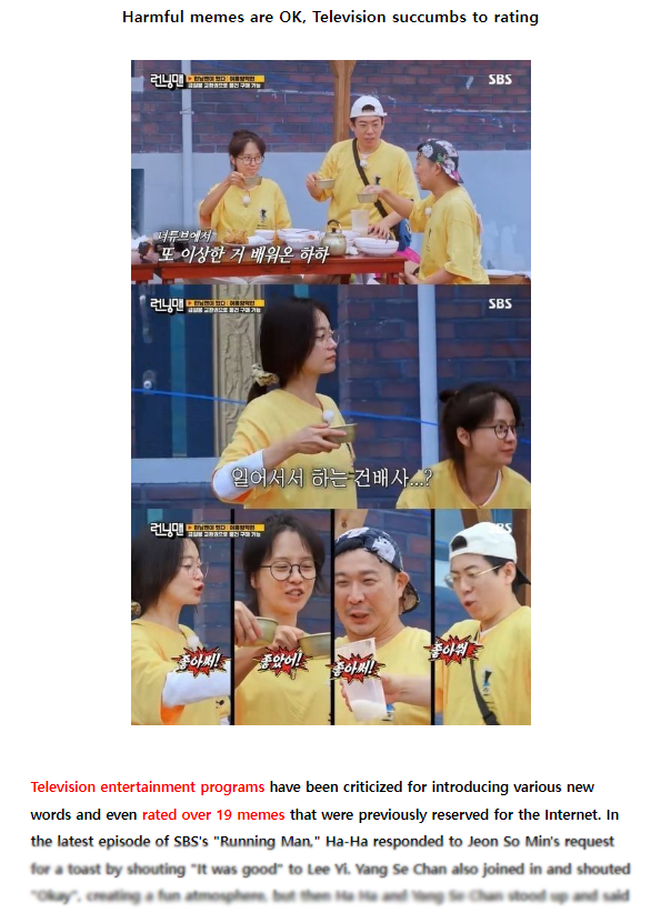 Television entertainment programs have been criticized for introducing various new words and even rated over 19 memes that were previously reserved for the Internet. In the latest episode of SBS's "Running Man," Ha-Ha responded to Jeon So Min's request for a toast by shouting "It was good" to Lee Yi. Yang Se Chan also joined in and shouted "Okay", creating a fun atmosphere, but then Ha Ha and Yang Se Chan stood up and said "Young Cha" and shook their lower bodies.