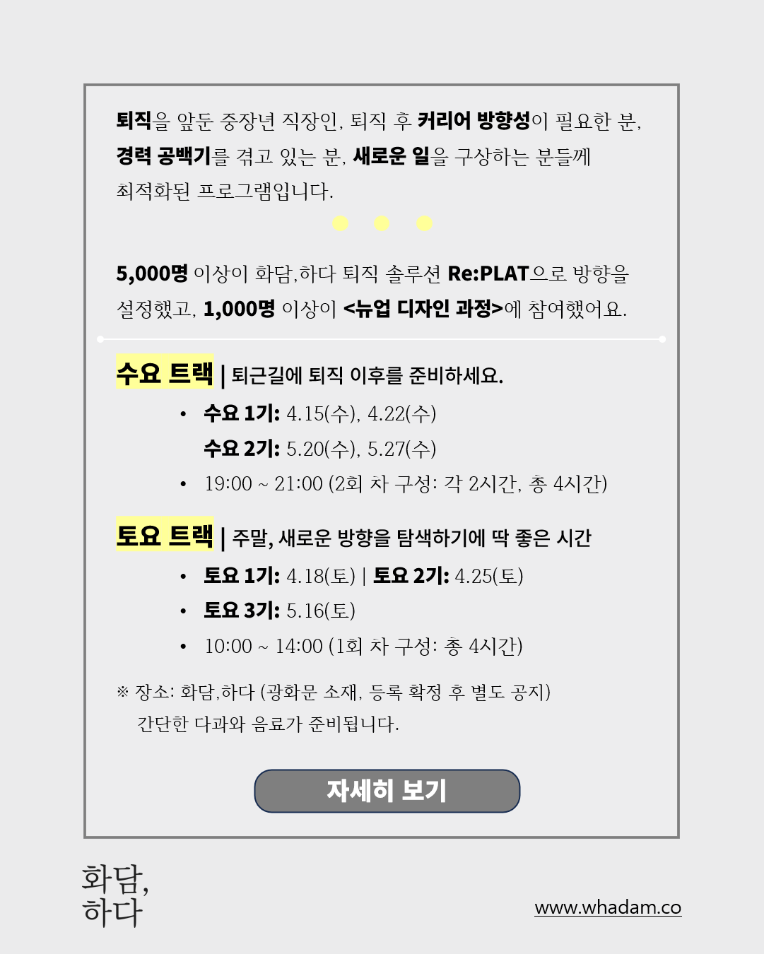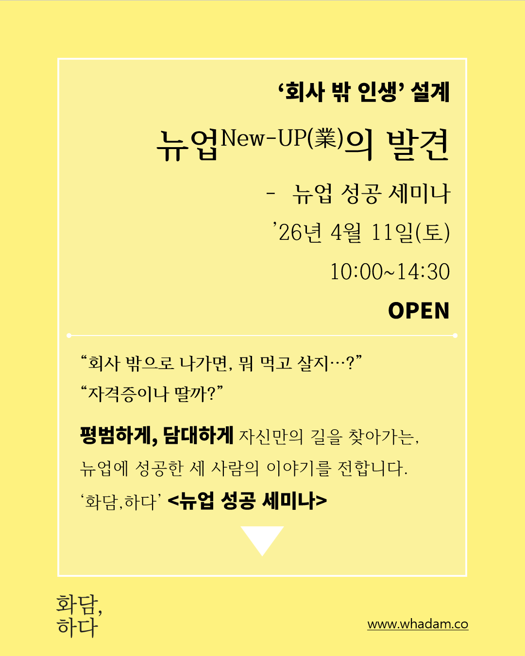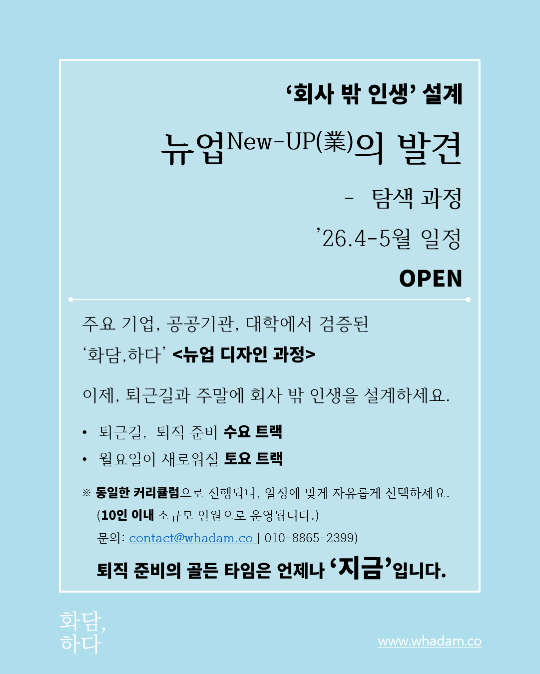 지난 6년, 주요 기업, 공공기관, 대학들과 퇴직에 대한 새로운 기준을 만들어 온 화담,하다가 여러분의 일상에 찾아갑니다.