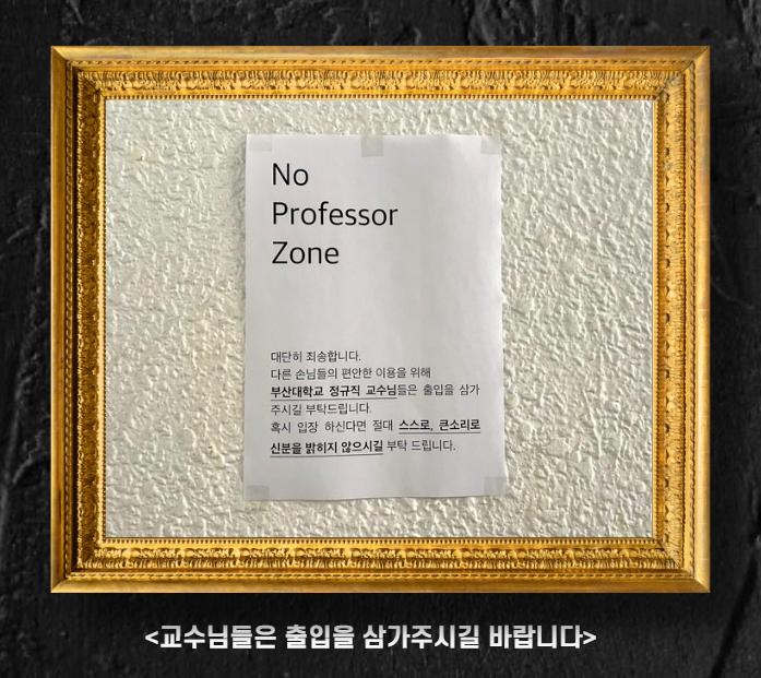 이에 교수들의 출입 자제를 요청하는 ‘노교수존’을 내건 부산대 앞 술집이 보도 하루 만에 작품 전시를 중단했습니다. 작가 역시 기존의 공지문 속 '노교수존이 혐오가 아니다'라고 말할 순 없다 등의 우려를 드러낸 것으로 확인되었습니다.
