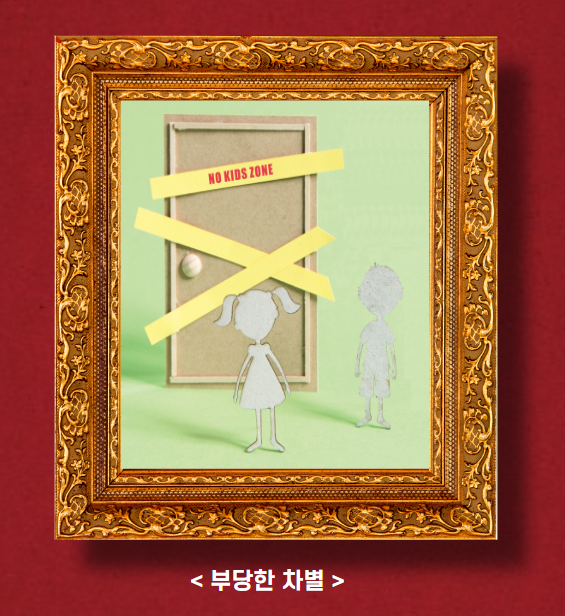 <부당한 차별>은 아동 및 아동을 동반한 보호자의 식당 이용을 전면적으로 배제하는 것은 일부의 사례를 객관적, 합리적 이유 없이 일반화한 것에 해당한다고 판단한 국가의 입장을 사실적으로 드러낸 작품입니다.