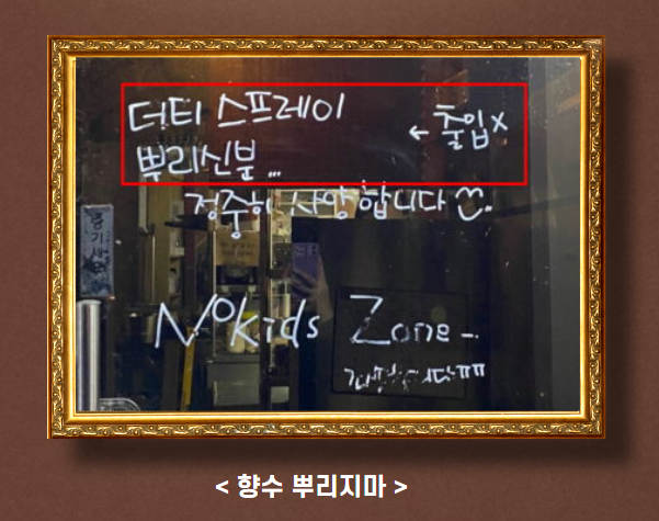 <향수 뿌리지마>는 지나친 향수 냄새에 대한 타 손님의 호소와 음식의 품질을 떨어뜨릴 수 있다는 업주의 우려 하에 향수 뿌린 손님의 방문을 거절하는 현 사회를 신랄하게 비판한 작품입니다.