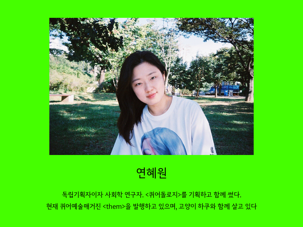 코로나19도 그렇고 여러모로 위축되어 있는 시기라는 생각이 든다. 고립감을 느끼는 분들도 많이 계실텐데, 그래서 더 연결되고 싶다. 나는 사람들을 연결할 수 있는 매체가 잡지라고 생각해서 잡지를 만들고 있다. 고립감을 느끼는 분들에게 우리가 좋은 동료가 될 수 있다는 걸 알아줬으면 좋겠다. 매거진 <them>과 함께 할 기회는 항상 열려 있다.