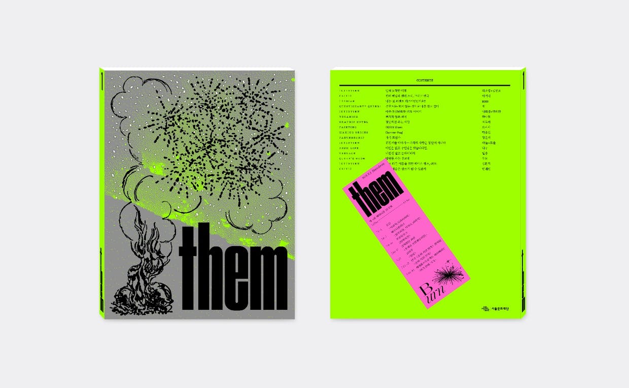 뿐만 아니라 서구권에서는 ’they’라는 3인칭이 퀴어를 지칭하는 새로운 인칭대명사로서 많이 알려져 있다. 일차적으로 ‘they’보다 ‘them’이 입에 더 달라붙고 <them>이후로 ‘예술하는 사람들’이라는 새로운 인칭대명사로 사용될 수 있다는 점에서 좋다고 생각했다. 제시했을 때 만장일치로 동의했다.