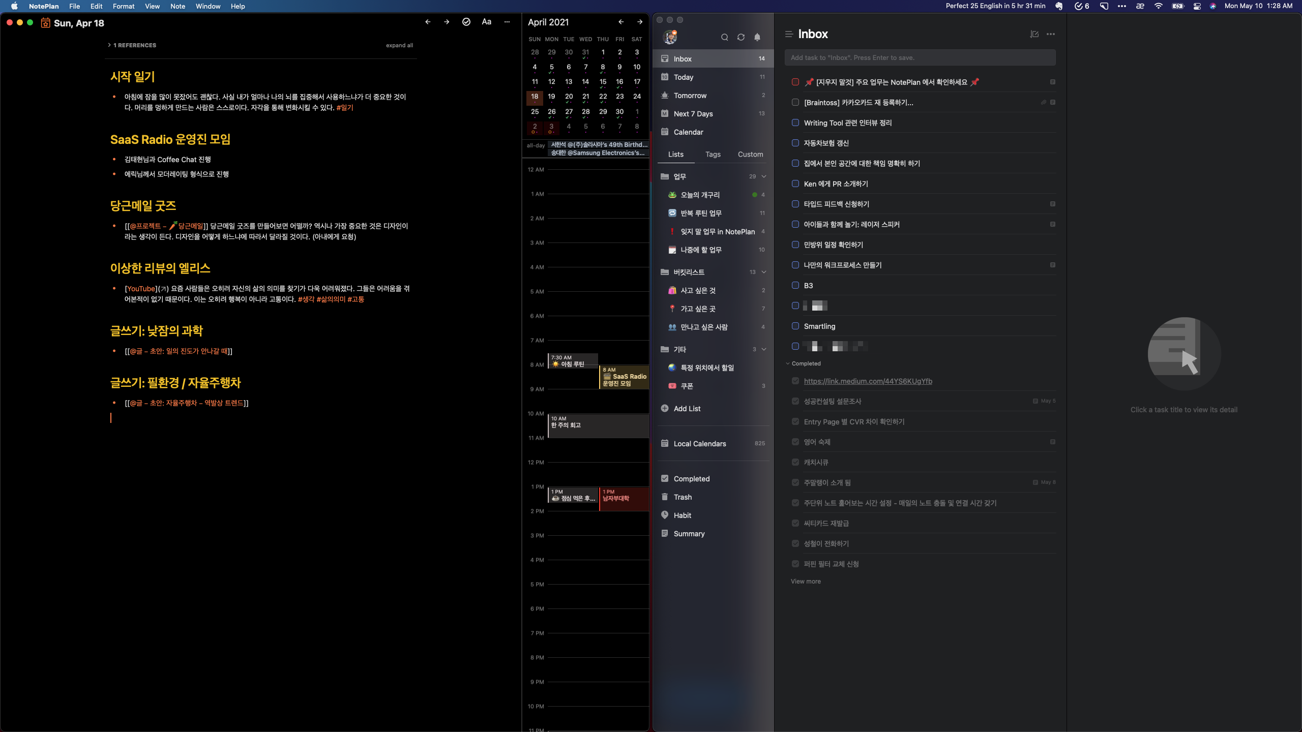 포스트잇과 다이어리 역시 업무에 있어 정말 중요한 도구입니다. 아이디어가 있을 때, 미팅에 참여할 때, 잊어버리지 말아야 할 할 일을 적을 때 우리는 포스트잇과 다이어리를 사용하여 상시 생각나는 내용을 적습니다. NotePlan3와TickTick 은 저에게 그러한 역할을 돕습니다. NotePlan3는 Daily Note를 만들 수 있어, 그날그날의 일정 위에 빠르게 생각을 기록할 수 있습니다. 또한, 요즘 유행하는 Zetelkasten 방식을 지원하여 언제든지 다른 메모들 추가로 생성하거나 연결할 수 있습니다. TickTick 에는 포스트잇과 같이 주요 업무들이나 잊지 말아야 할 할 일들을 바로바로 적어두기 편리합니다. 이후 시간을 내어 한 번에 처리할 수 있습니다. 포스트잇과 다이어리가 그렇듯 NotePlan3와 TickTick은 업무 중 가장 많이 사용되는 도구입니다.