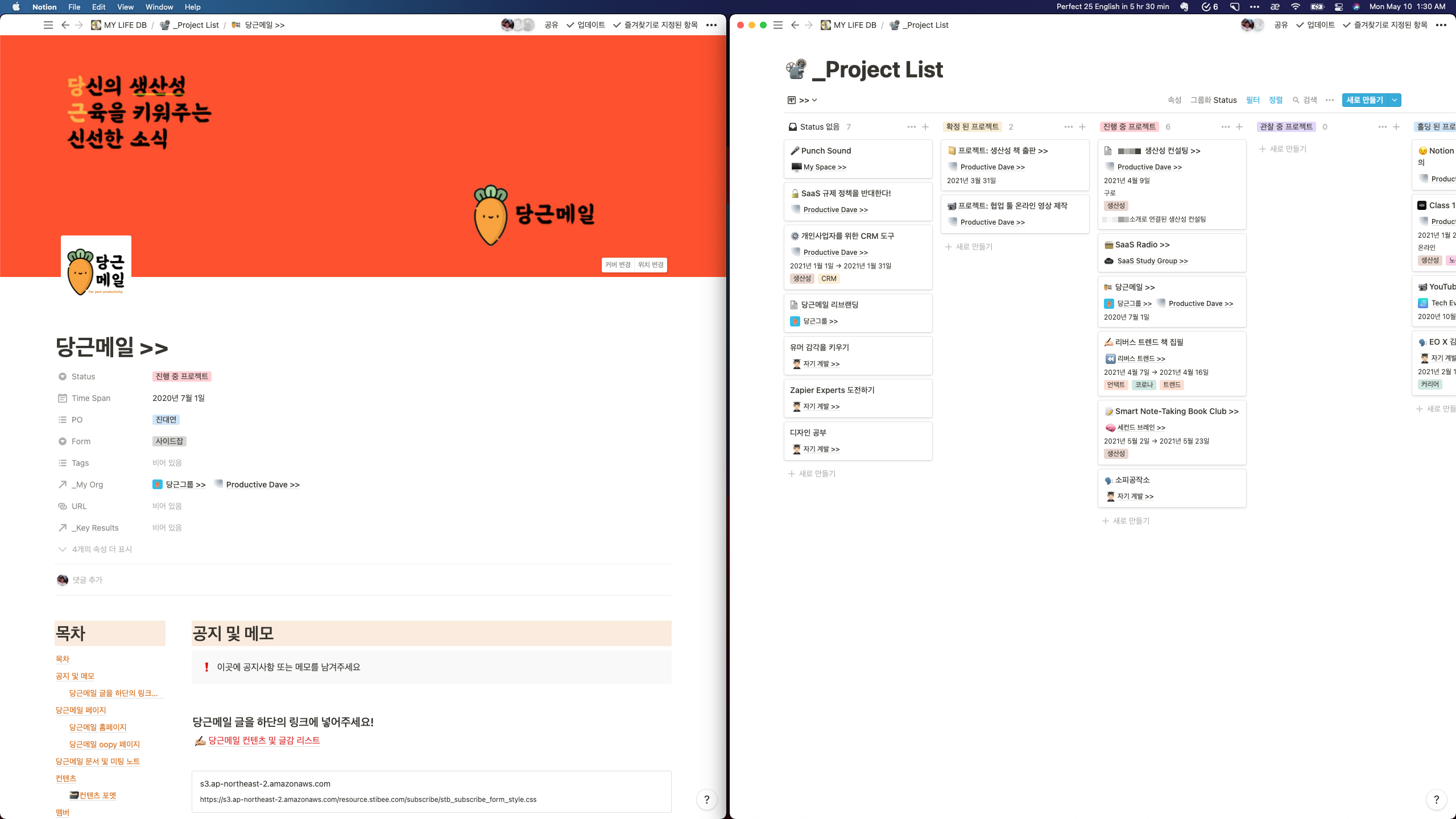프로젝트 성 업무를 진행하게 되면 이곳저곳 산재한 정보를 하나로 잘 정리해 둘 필요가 있습니다. 그래서 우리는 평소 화이트 보드 위에 표를 만들어 정리하거나, 중요한 정보들을 포스트잇으로 붙여서 적절히 표시해 둡니다. 이렇게 정리해두면 전체 진행 상황들을 한눈에 확인할 수 있어 큰 그림을 보며 빠지지 않게 프로젝트를 챙길 수 있습니다. 이러한 용도로 제가 사용하는 생산성 도구는 바로 Notion입니다. Notion의 경우 다양한 형식의 블록을 만들어 정보를 보기 좋게 배치할 수 있으며, 다른 사람들과도 손쉽게 공유할 수 있어 프로젝트 보드로 제격입니다.