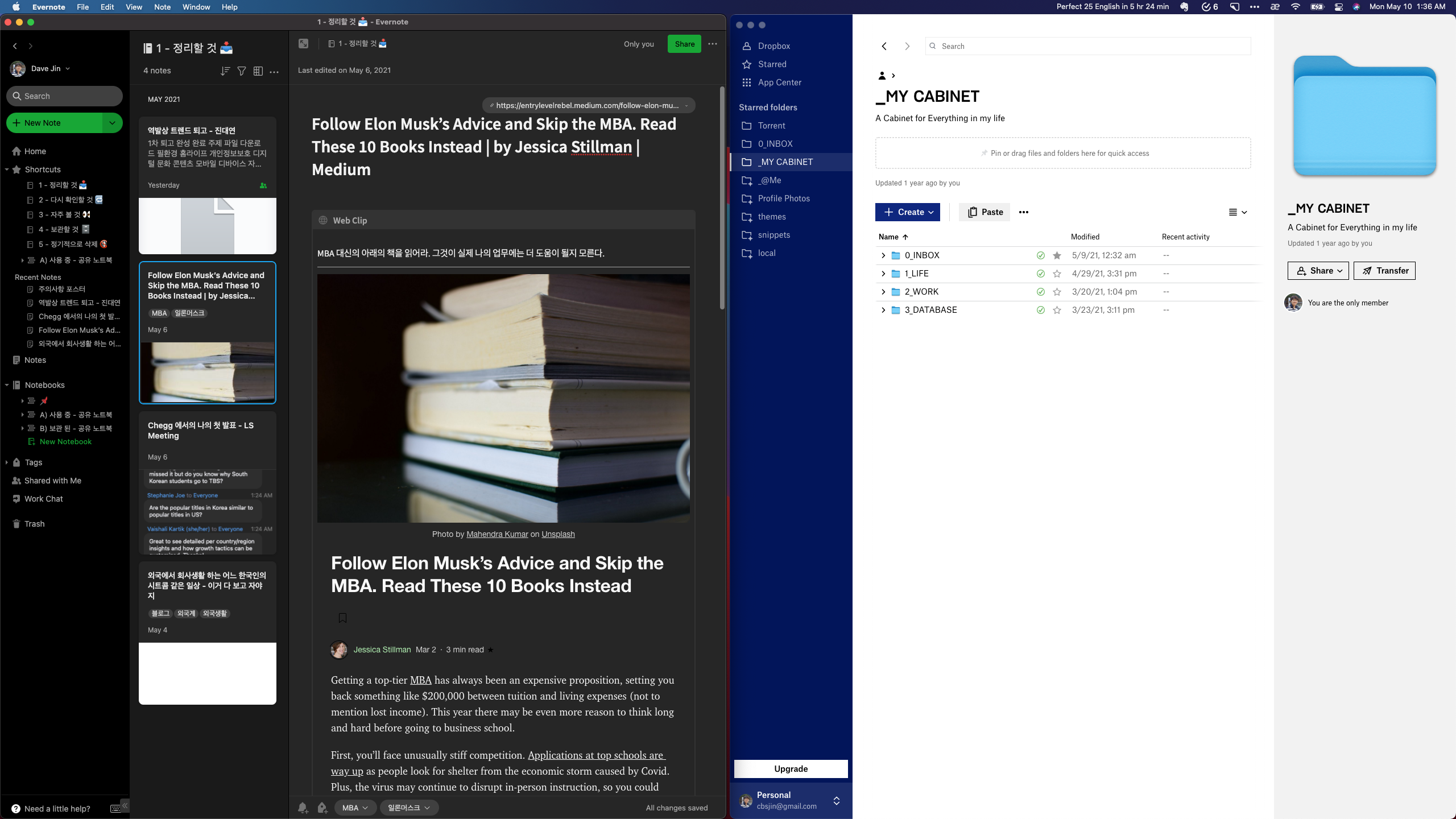 지금 당장 필요하진 않아도 잘 정리해두고 종종 꺼내 보아야 하는 정보들이 있습니다. 우리는 이러한 정보들을 파일철 또는 캐비넷에 잘 정리하여 보관합니다. 저에게 있어 Evernote와 Dropbox는 바로 파일철과 캐비넷의 역할을 합니다. 특히 Evernote는 문서 및 이미지 내 글자 검색이 가능하며, 문서를 설명할 수 있는 다양한 정보들을 노트에 함께 적어 놓을 수 있어서 다양한 형식의 파일들과 정보를 담아 정리하는데 제격입니다. 그래서 저는 대부분이 정보들을 Evernote에 저장합니다. 반면 Evernote는 단일 노트의 경우 최대 200M까지밖에 업로드되지 않기 때문에 고용량의 이미지 또는 비디오 파일 등을 저장하기 위해 Dropbox를 추가로 사용하고 있습니다. 그러나 이때에도 Evernote 내에 Dropbox 링크 또는 정보를 함께 적어두면 Evernote 한 곳에서 Dropbox 내의 내용도 검색할 수 있습니다. 이제 Evernote를 활용하면 열심히 모아둔 나의 소중한 자료들을 검색하고 재활용 할 수 있습니다.