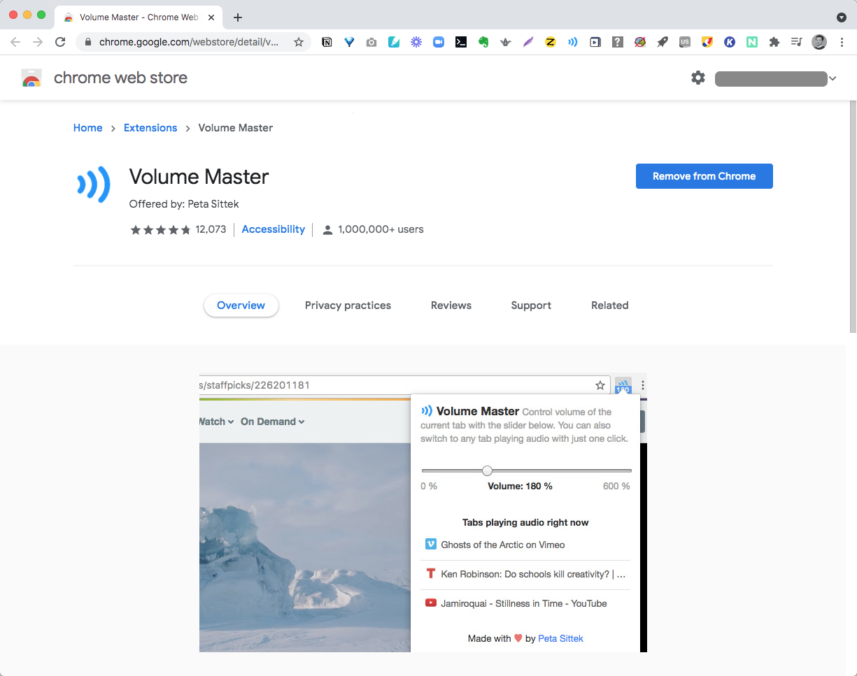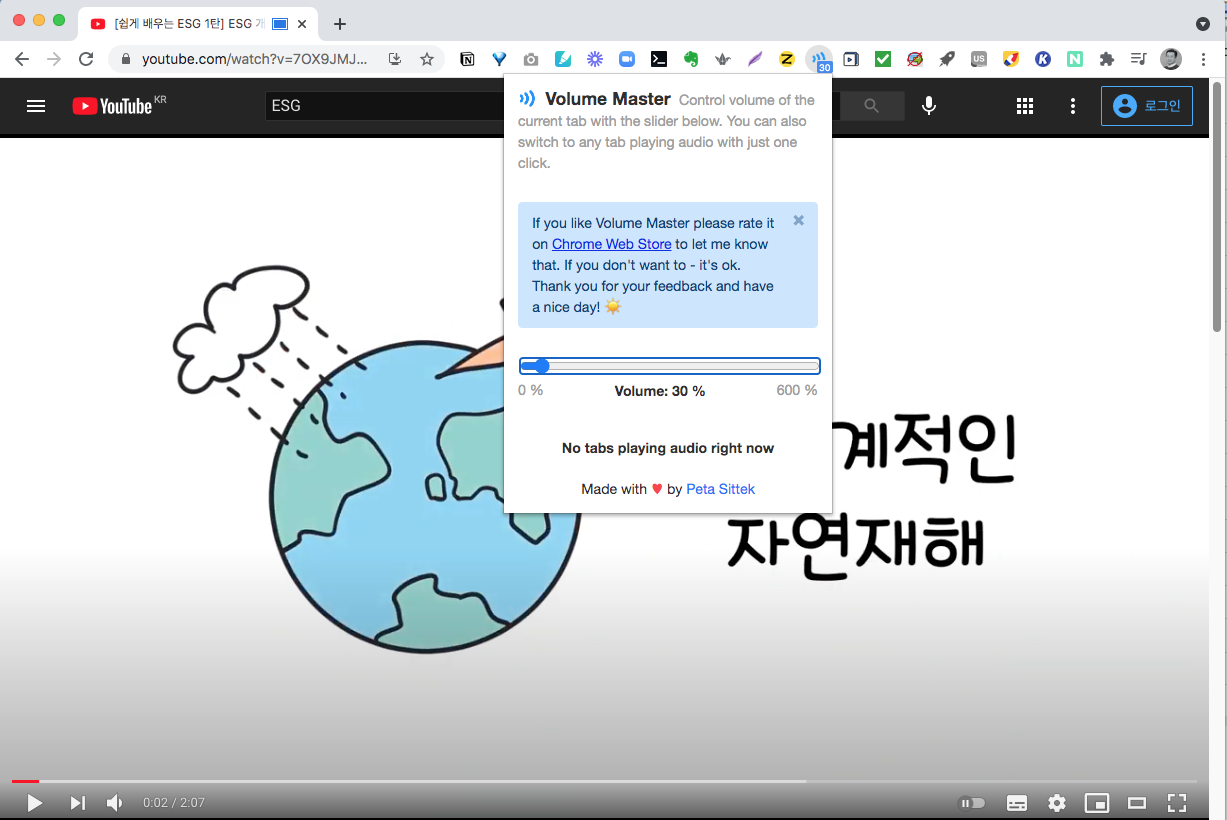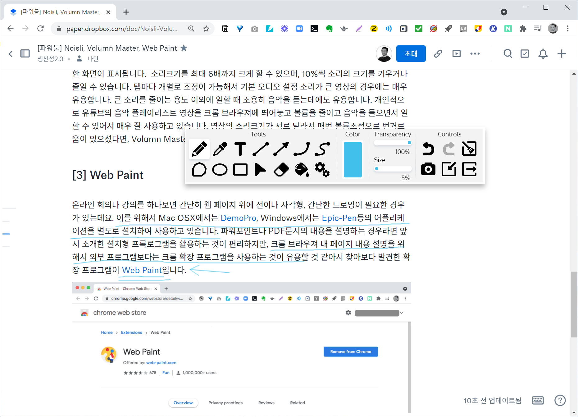 개인적으로 업무집중이 필요한 일을 시작하기에 앞서 5-10분정도 Noisli를 활용해서 집중력을 높이거나 업무간의 쉬는 시간에 5분정도 백색소음을 듣다보면 긴장감도 줄어들고 업무에 다시 몰입할 수 있어서 매우 유용하게 활용하고 있네요(한참을 듣다보면 숲속 안에 있는 기분이 들기도 합니다. 소리의 공간감이 매우 놀랍네요). 다만, 무료 버전에서는 Noisli에서 제공하는 백색소음의 소스들이 한정적이고, 일이나 공부특성에 알맞는 플레이리스트도 제한되어 유료 사용을 고려해보고 있답니다. [2] Volume Master 크롬브라우져에서 여러 탭에 유튜브를 보거나 포털 내 미디어 정보를 제공하는 페이지에서 영상등의 플레이가 되는 경우, 소리의 크기가 서로 달라서 기본 볼륨크기보다 작게 들이거나 크게들이는 경우를 경험해보셨을터인데요. 탭마다 소리를 조절할 수 있는 기능이 있으면 좋겠다고 생각하던 차, Volume Master를 발견하게 되었습니다. ![]() ![]() 현재 100만명이상이 사용하고 있는 확장 프로그램으로, 사용방법은 매우 간단합니다. 확장 프로그램을 설치하면 상단에 Volume Master 아이콘이 표시됩니다. 해당 아이콘을 클릭하면 볼륨조정을 위한 화면이 표시됩니다. 소리크기를 최대 6배까지 크게 할 수 있으며, 10%씩 소리의 크기를 키우거나 줄일 수 있습니다. 탭마다 개별로 조정이 가능해서 기본 오디오 설정 소리가 큰 영상의 경우에는 매우 유용합니다. 큰 소리를 줄이는 용도 이외에 일할 때 조용히 음악을 듣는데에도 유용합니다. 개인적으로 유튜브의 음악 플레이리스트 영상을 크롬 브라우져에 띄어놓고 볼륨을 줄이고 음악을 들으면서 일할 수 있어서 매우 잘 사용하고 있습니다. 영상의 소리크기가 서로 달라서 매번 볼륨조정으로 번거로움이 있으셨다면, Volume Master가 그러한 불편을 줄여주는데 큰 도움이 될 것 같네요. [3] Web Paint ![]() ![]() 크롬확장 프로그램을 설치하고, 상단의 Web Paint 아이콘을 클릭하면 크롬 브라우져의 내에 메뉴창이 표시됩니다. 페인팅을 위해서 필요한 기본 도구들 - 펜, 글자, 직선, 화살표, 도형, 스포이드(색상 추출), 자유선 - 이 표시되며, 화면 캡쳐와 redo/undo, 단축키 설정 기능등이 제공됩니다. 문서 위에 띄어 놓고 텍스트 작성이나 편집이 가능하며(화살표 모양의 아이콘 선택 시 웹페이지에서의 입력 기능을 지원), 설명이 필요한 경우 편집모드의 해제를 통해 웹페이지에 도화지처럼 드로잉이나 페인팅이 가능합니다. 웹기반의 문서작성이 가능한 Google Docs나 Dropbox의 Paper와 같은 웹서비스를 사용한다면 매우 유용합니다. 온라인에서 공동 문서 편집작업을 수행하고, 중요하거나 반드시 강조해야할 내용들을 하이라이트하거나 표시해야하는 경우 “볼드체”나 “이탤릭체”로 강조하기 보다 직접 내용 부분에 형광펜처럼 표시하거나 강조부호를 그려넣을 수 있다는 점에서 협업에도 유용할 것 같네요.