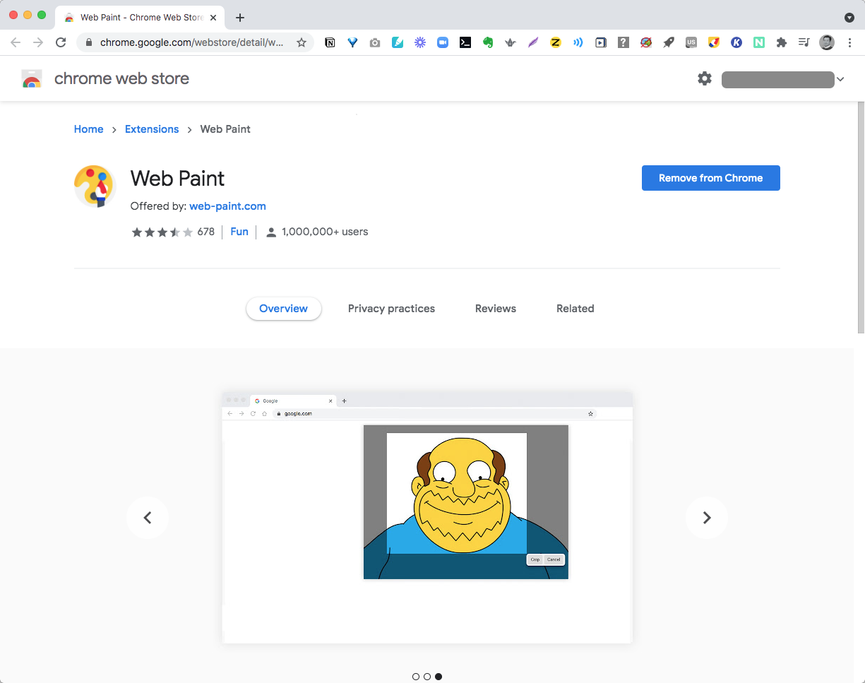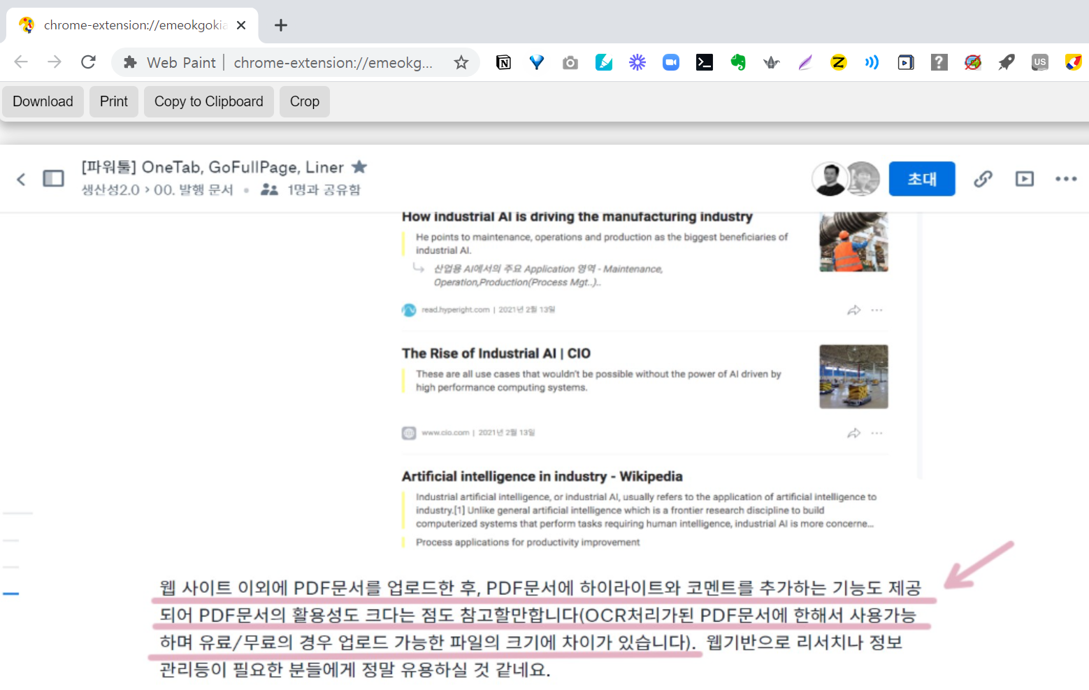 Web Paint를 사용해서 드로잉하거나 페인트한 영역은 따로 저장되지 않기때문에 웹 페이지의 표시 영역을 캡쳐해서 저장하는 것이 필요합니다. 메뉴영역에서 “카메라”모양의 아이콘을 클릭하면 아래와 같이 화면이 캡쳐되고 다운로드나 출력이 가능하며, Crop기능이 있어서 이미지에서 필요한 부분만을 선택해서 저장하거나 출력할 수 있습니다. 사용의 편의성이 높아서 매우 유용하네요.