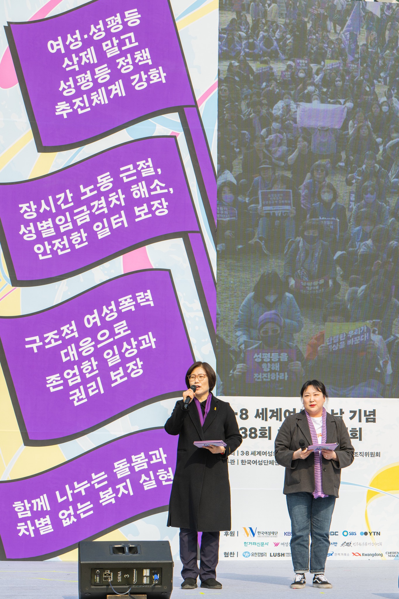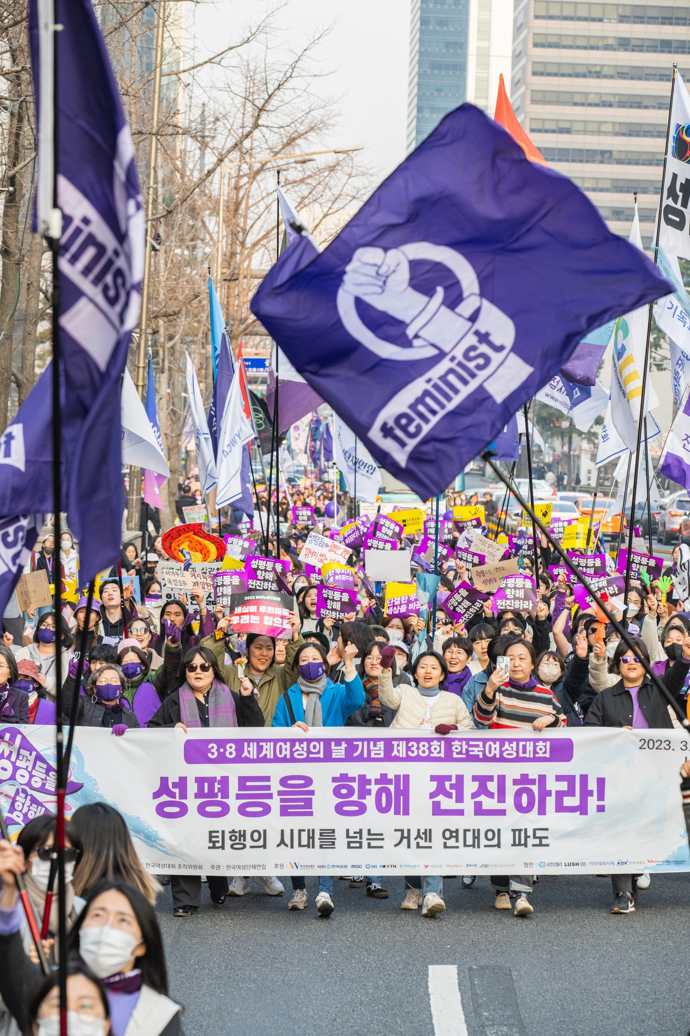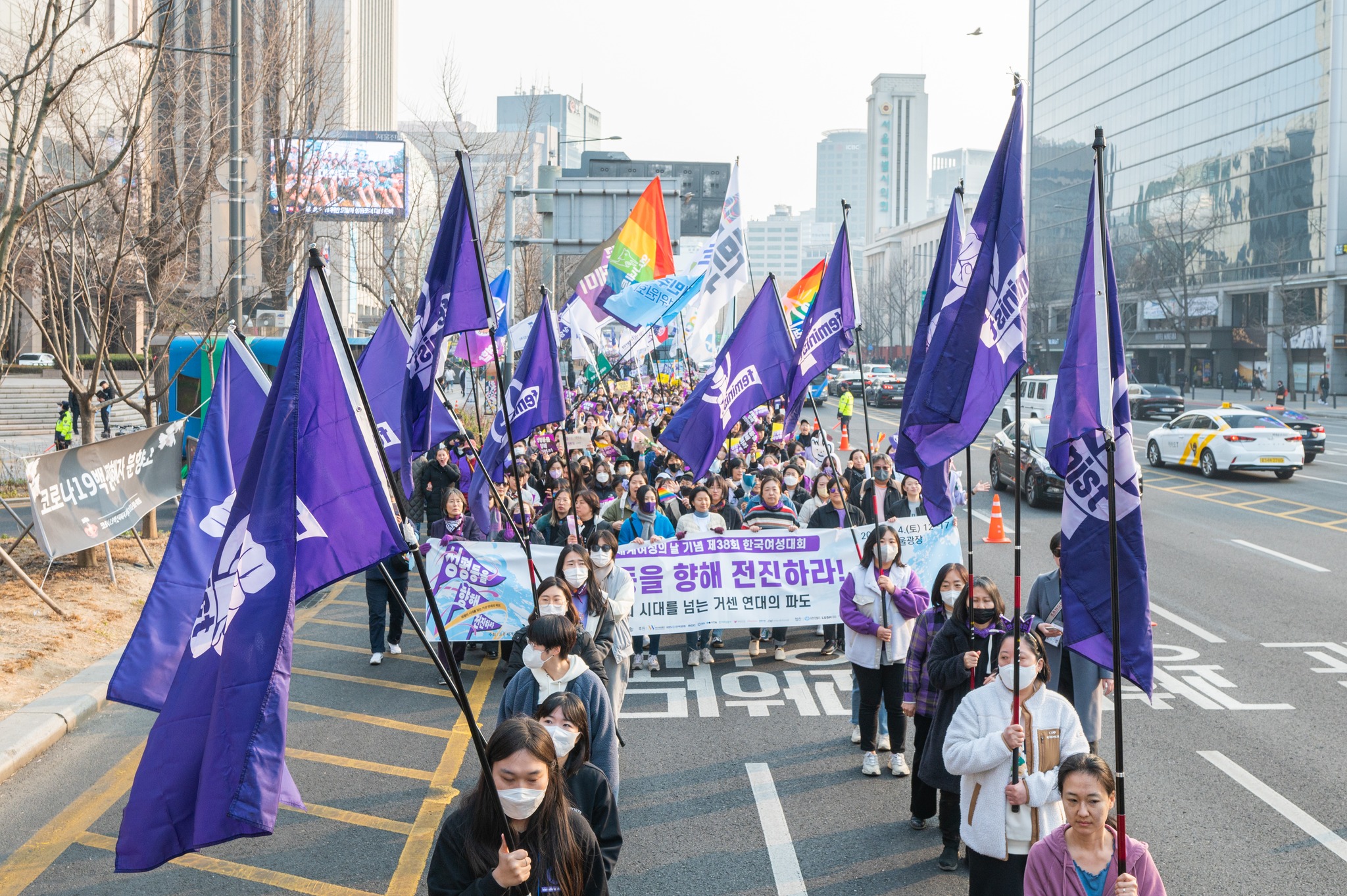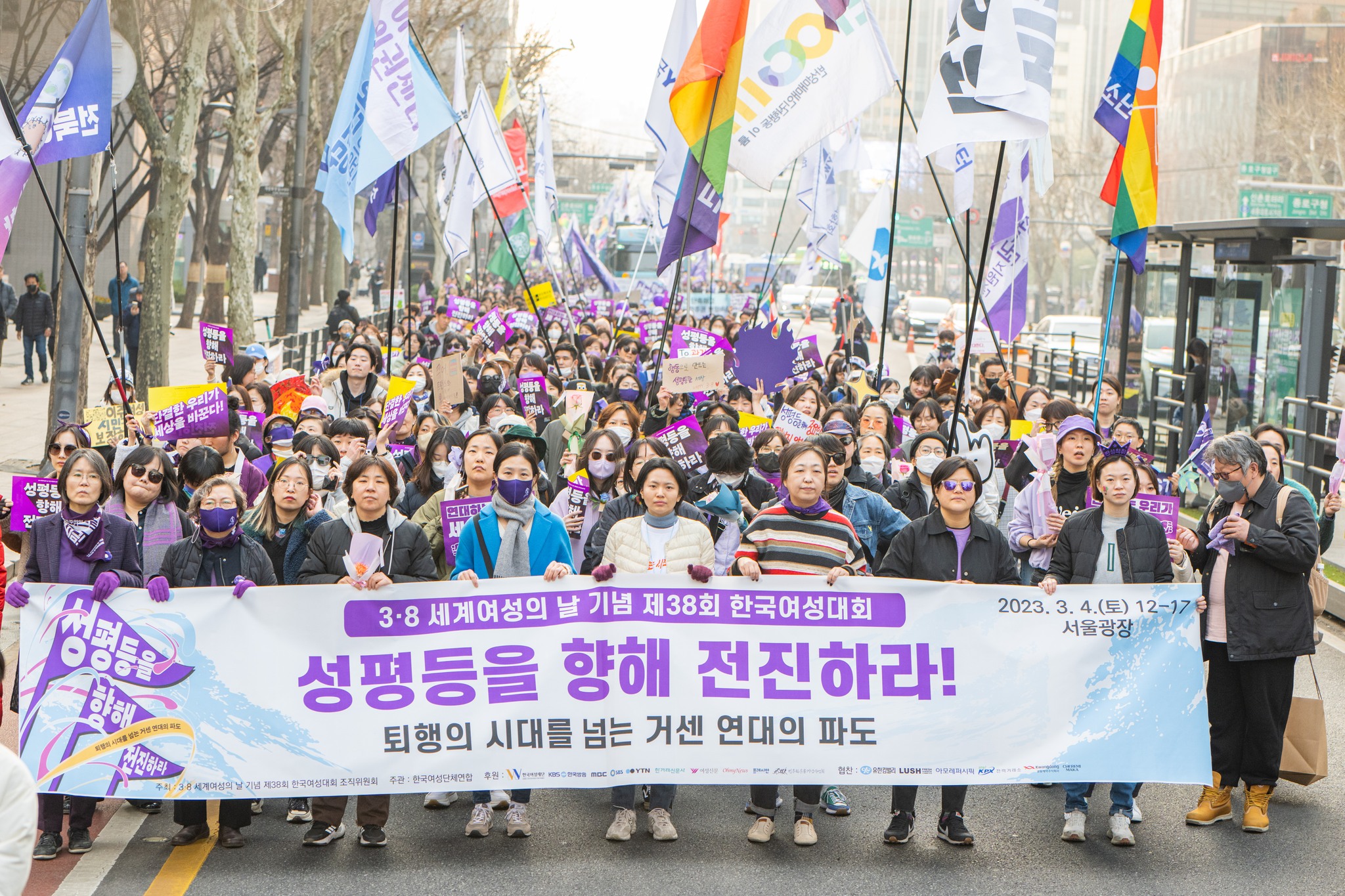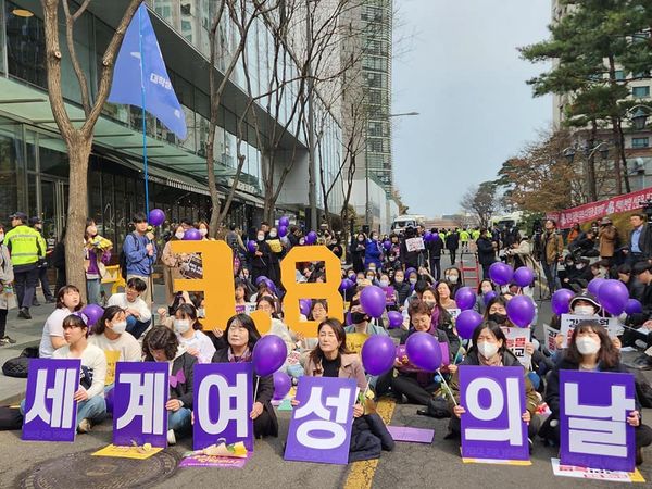 3월 4일(토) 오후 12시부터 서울광장에서 3.8세계여성의 날 기념 제38회 한국여성대회가 개최되었습니다. ‘성평등을 향해 전진하라–퇴행의 시대를 넘는 거센 연대의 파도’ 슬로건으로 개최된 이번 대회에는 전국에서 모인 1만 5천 여명(연인원) 여성‧시민들이 성평등 사회로의 전진을 다짐했습니다.