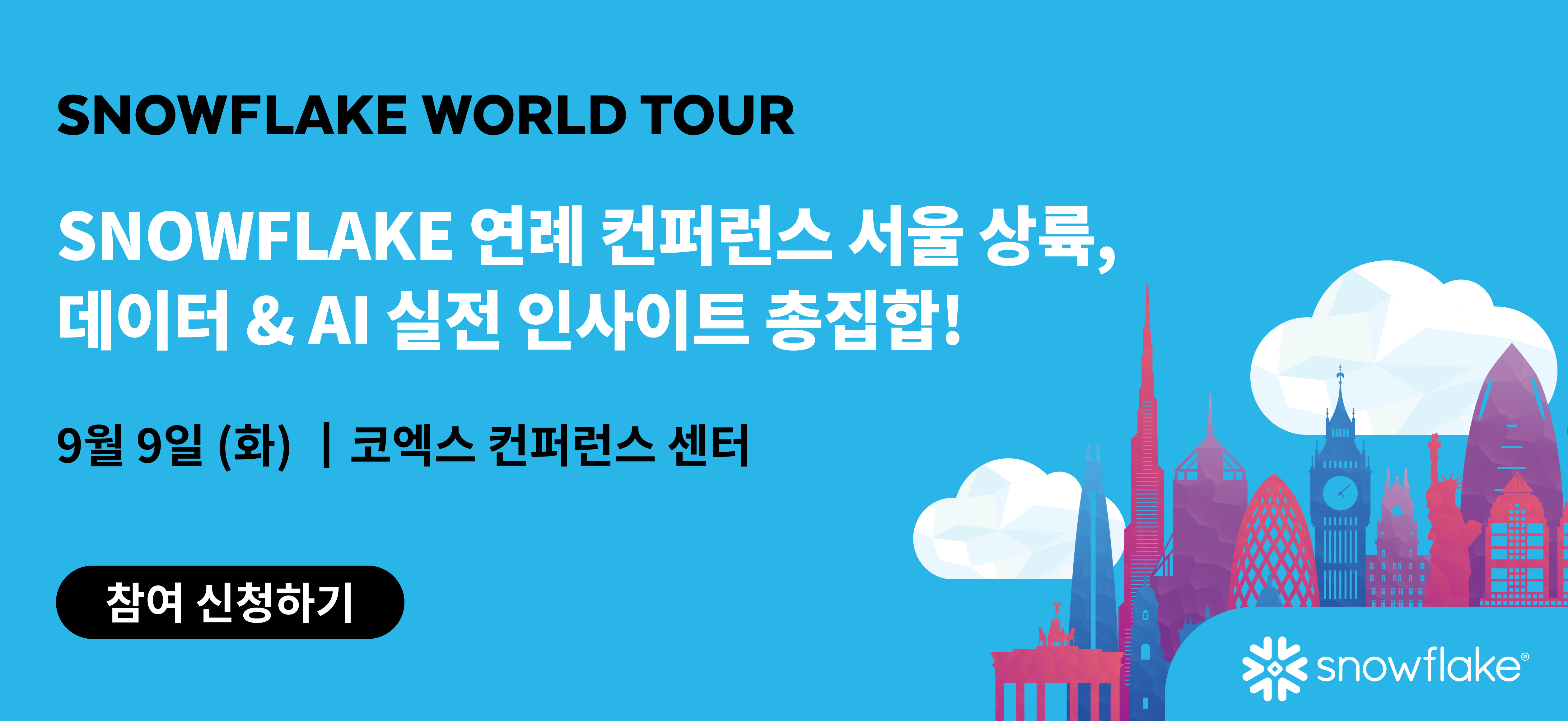 ๊ธ๋ก๋ฒ AI ๋ฐ์ดํฐ ํด๋ผ์ฐ๋ ๋ฆฌ๋ Snowflake๊ฐ ์ฃผ์ตํ๋ 'Snowflake World Tour ์์ธ'์ด 9์, ์์ธ์ ์๋ฅํด์!๐