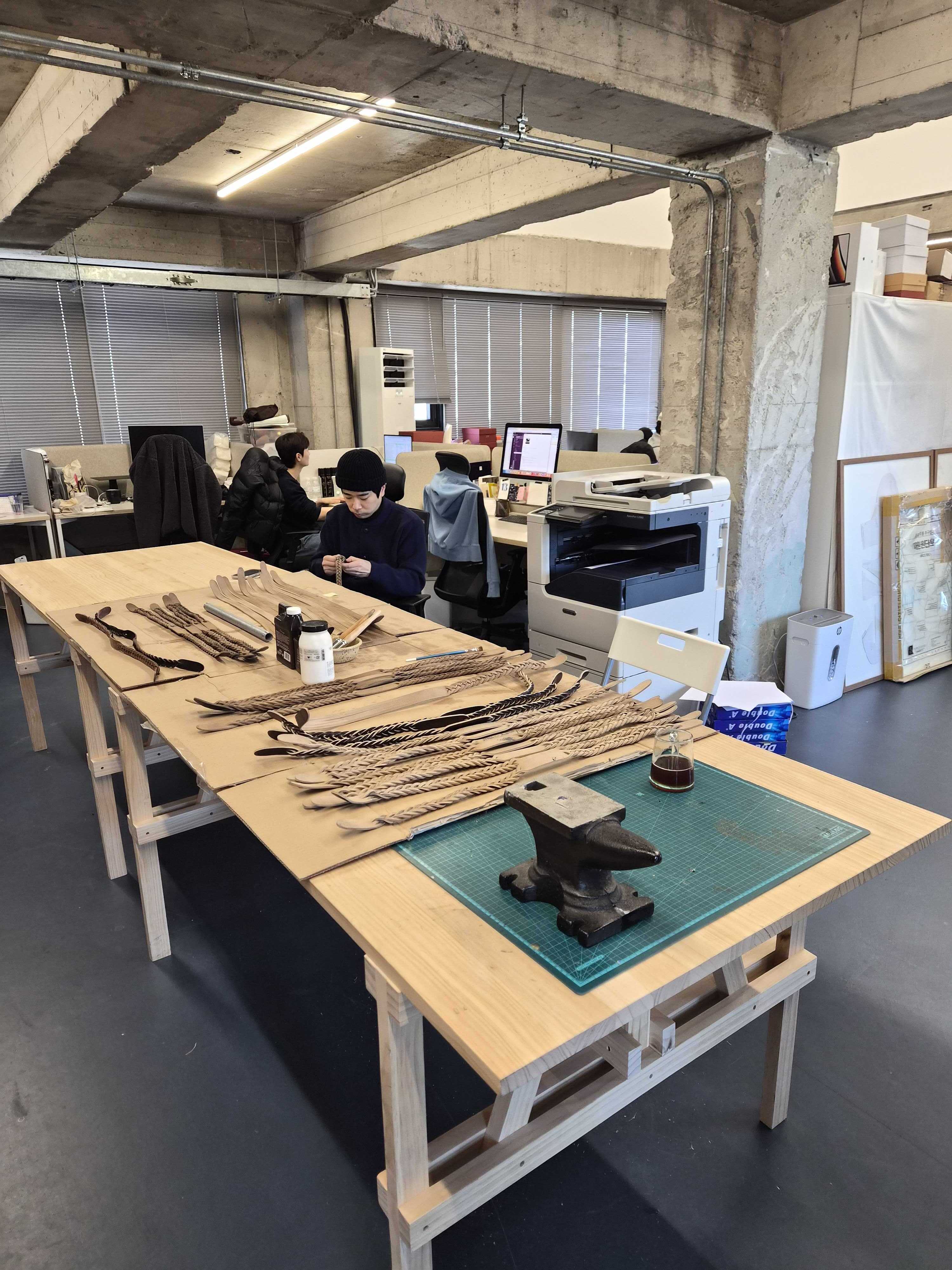 층마다 다른 역할과 온도를 가진 공간들이 모여 지금의 나를 만든다. 그래서 소개하고 싶은 공간도 자연스럽게 많아졌다. 먼저 4층 작업대. 사무 일을 하는 동료들 옆에 아주 큰 작업대 하나가 놓여 있다. 가죽을 재단하고, 오일을 칠하고, 토코놀을 바르고, 망치로 리벳을 다는 공간이다. 이곳에서 작업을 하다 보면 동료들이 종종 “지금 뭐 만들고 있어?” 하고 말을 걸어온다. 그 질문을 시작으로 제품에 대한 이야기가 더 깊어지고, 서로의 생각을 나누는 시간이 된다. |