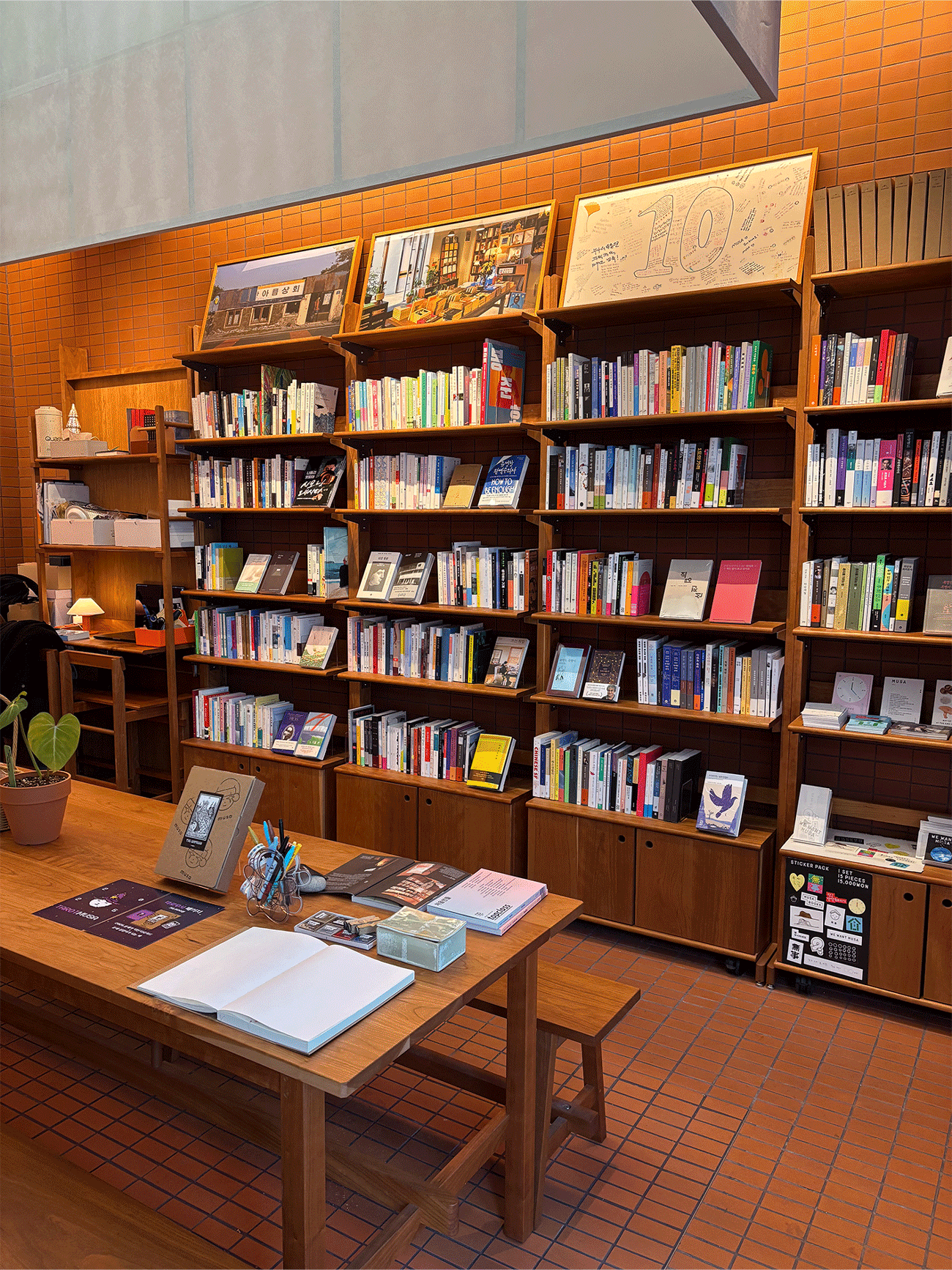맹그로브 신촌에 자리한 독립 서점 '책방 무사'. 빨간 벽돌 건물 안으로 들어서니 호주의 어느 동네 서점에 온 듯한 분위기가 감돈다. 규모는 작지만 선별된 책들이 빼곡히 채워져 있어 한참을 구경했다. 북토크, 낭독회, 독서 모임 등 다채로운 프로그램 이력을 보니 단순히 책을 파는 곳이 아니라 독서를 사랑하는 이들의 문화를 만들어가는 공간이라는 느낌을 받았다.📚 읽고 싶은 책이 여럿 눈에 들어왔지만, 읽는 속도가 느린 나에겐 아직 읽어야 할 책들이 쌓여 있어 참았다… 그래도 거의 다 읽어가니 곧 다시 방문해 천천히 골라봐야겠다.