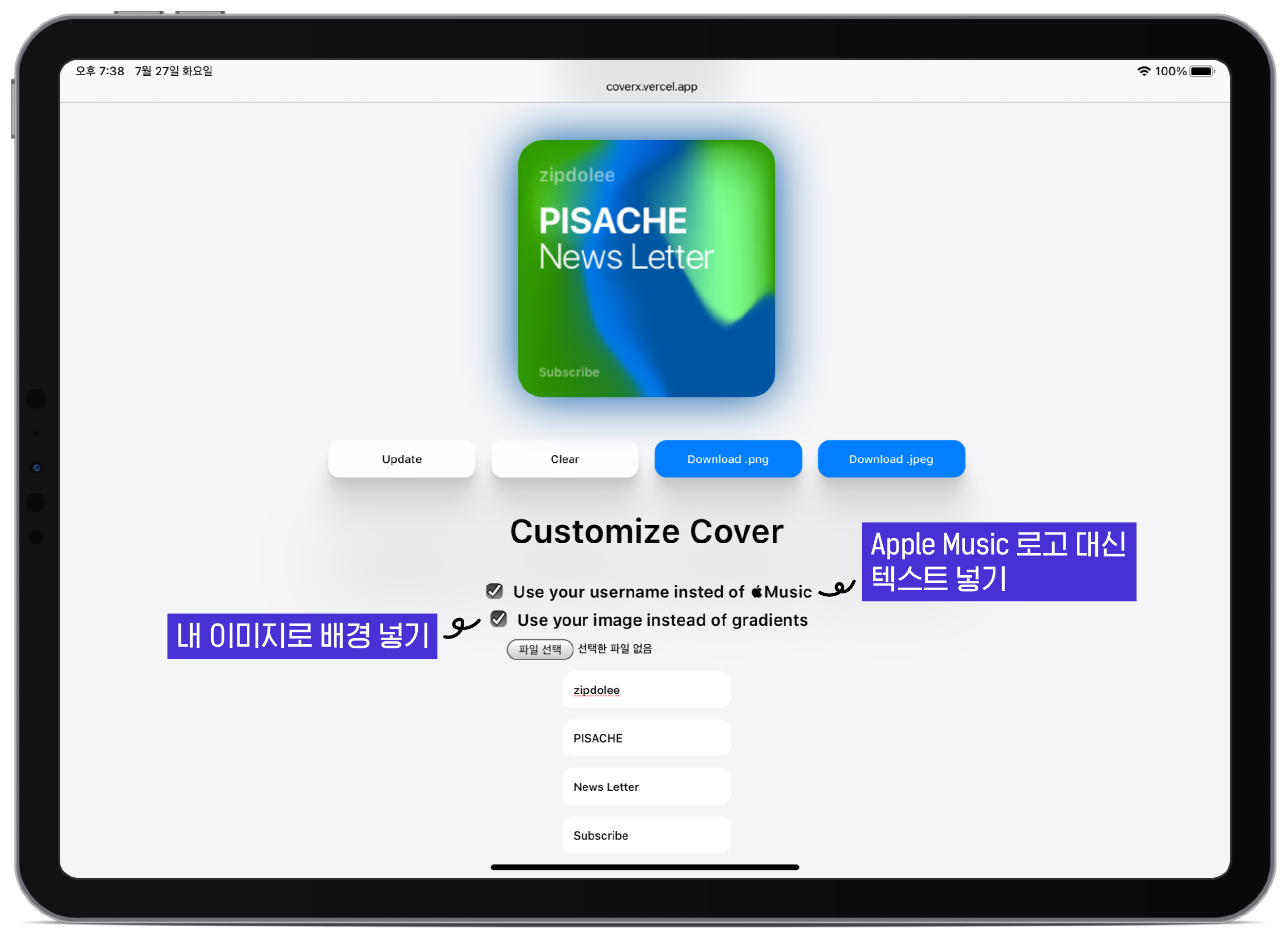 ์คํธ๋ง ์ค๋นํด๋ ์ถฉ๋ถํ๋ต๋๋ค. ์ฌ์ง์ด Apple Music ๋๋์ ์ปค๋ฒ๋ฅผ ๋ง๋ค์ด์ฃผ๊ธฐ ๋๋ฌธ์ Apple ๊ฐ์ฑ์ ์ข์ํ์ ๋ค๋ฉด ๊ผญ ์ด์ฉํด๋ณด์ธ์! ๐ ์๋ ๊ฐ์ด๋ ์ด๋ฏธ์ง๋ฅผ ์ฐธ๊ณ ํ๋ฉด ํค๋งค์ง ์๊ณ ์ฝ๊ฒ ๋ง๋ค ์ ์์ด์. CoverX๋ฅผ ์ถ์ฒํ๋ ์ด์ ๋ ๊ตณ์ด ์ด๋ฏธ์ง๋ฅผ ์ฐพ์ ํค๋งค์ง ์์๋ ๊ธฐ๋ณธ์ผ๋ก ์ ๊ณตํ๋ ๊ทธ๋ผ๋ฐ์ด์