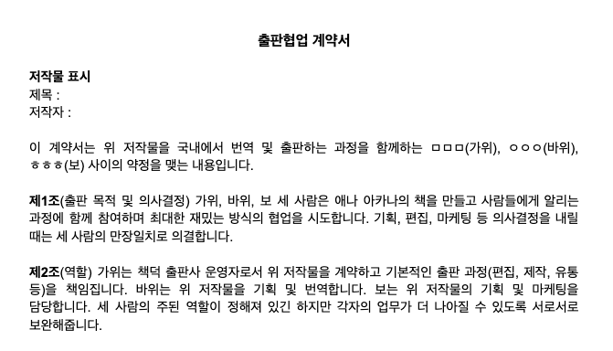 민 처음에는 여러 이야기가 산발적으로 나왔는데요. 계약은 일을 시작하는 사람들이라면 누구나 '첫 번째로' 하는 일이라서 먼저 다뤄야겠다고 생각했어요. 무엇보다 구성원들이 출판사를 하면서 흔히 '표준계약서'라고 불리는 것이 우리가 하고 싶은 이야기를 전혀 담아내지 못하고 있다는 문제의식에 모두 공감을 했고요.