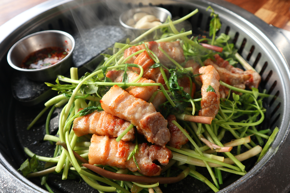 Hot! 요즘 고깃집, 미나리 푸드 페어링이 대세! • 벽에 싱그러운 미나리 포스터를 붙이거나 미나리 컬러 인테리어 연출 • 불판 위에 미나리 한가득, 생고기와 같이 구워 먹는 조합으로 눈길