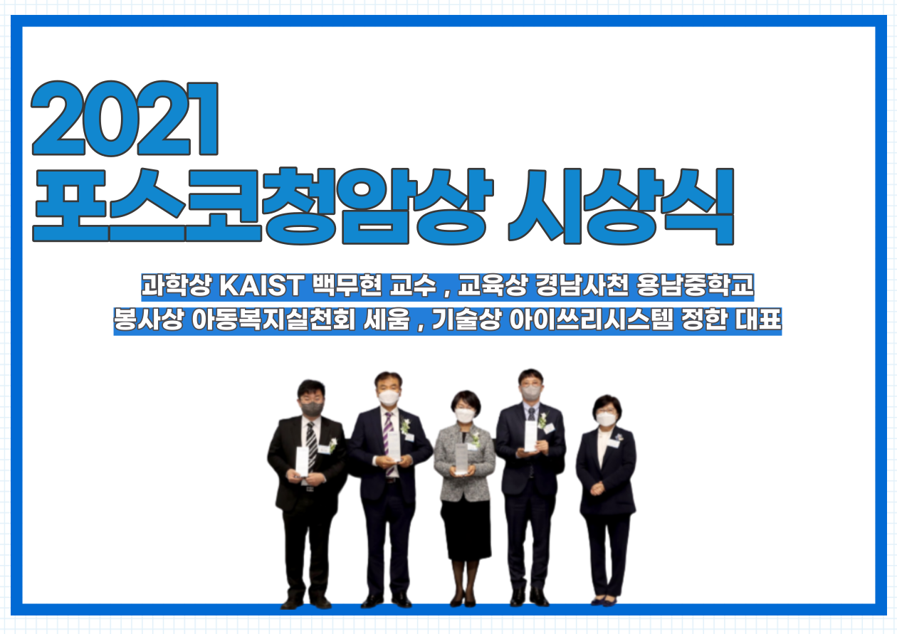 2021.04.08 제 15회 2021 포스코청암상 시상식 개최(4.6) 시상식 전 과정을 유튜브 채널을 통해 생중계하여 온라인으로 천 명이 넘는 관중이 포스코청암상 시상식에 함께했습니다. "나도 큰 사고를 당해봤기 때문에 더더욱 힘든 일이 있을 때 도와야 한다는 생각을 했습니다." 차량 하천 추락·전복사고 현장에서 장애를 가진 몸으로 구조활동을 펼쳐 3명의 소중한 인명을 구한 시민 김기문씨를 히어로즈로 선정하였습니다.