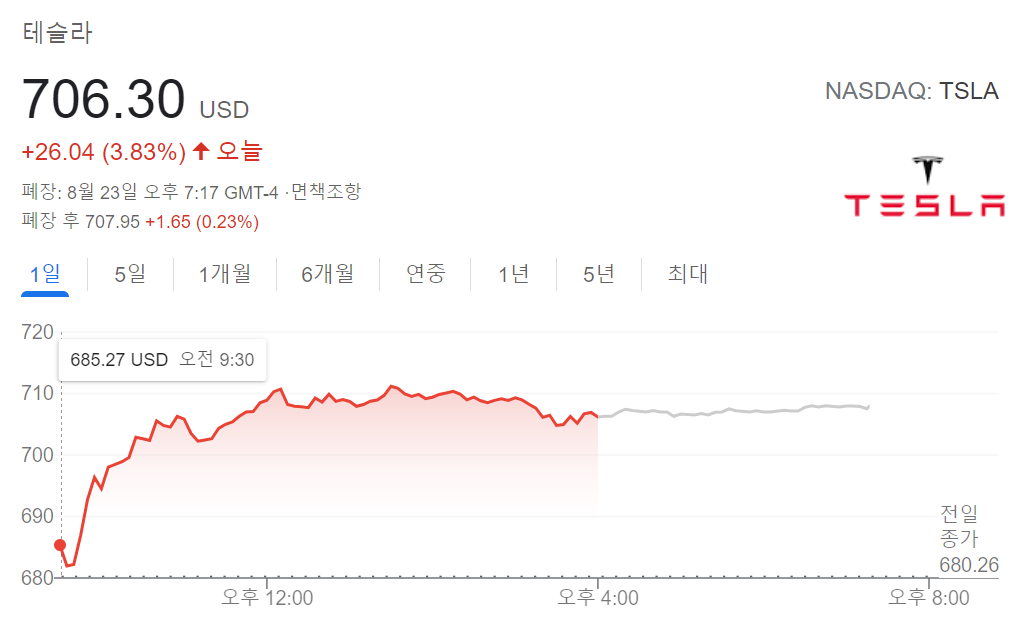 ์ฌ๋ผ(TSLA) ์ฃผ๊ฐ๋ 23์ผ ๋ด์ ์ฆ์์์ 3.83% ์ฌ๋์ต๋๋ค. ์์ฆ ์๊ฐ์์๋ ํ