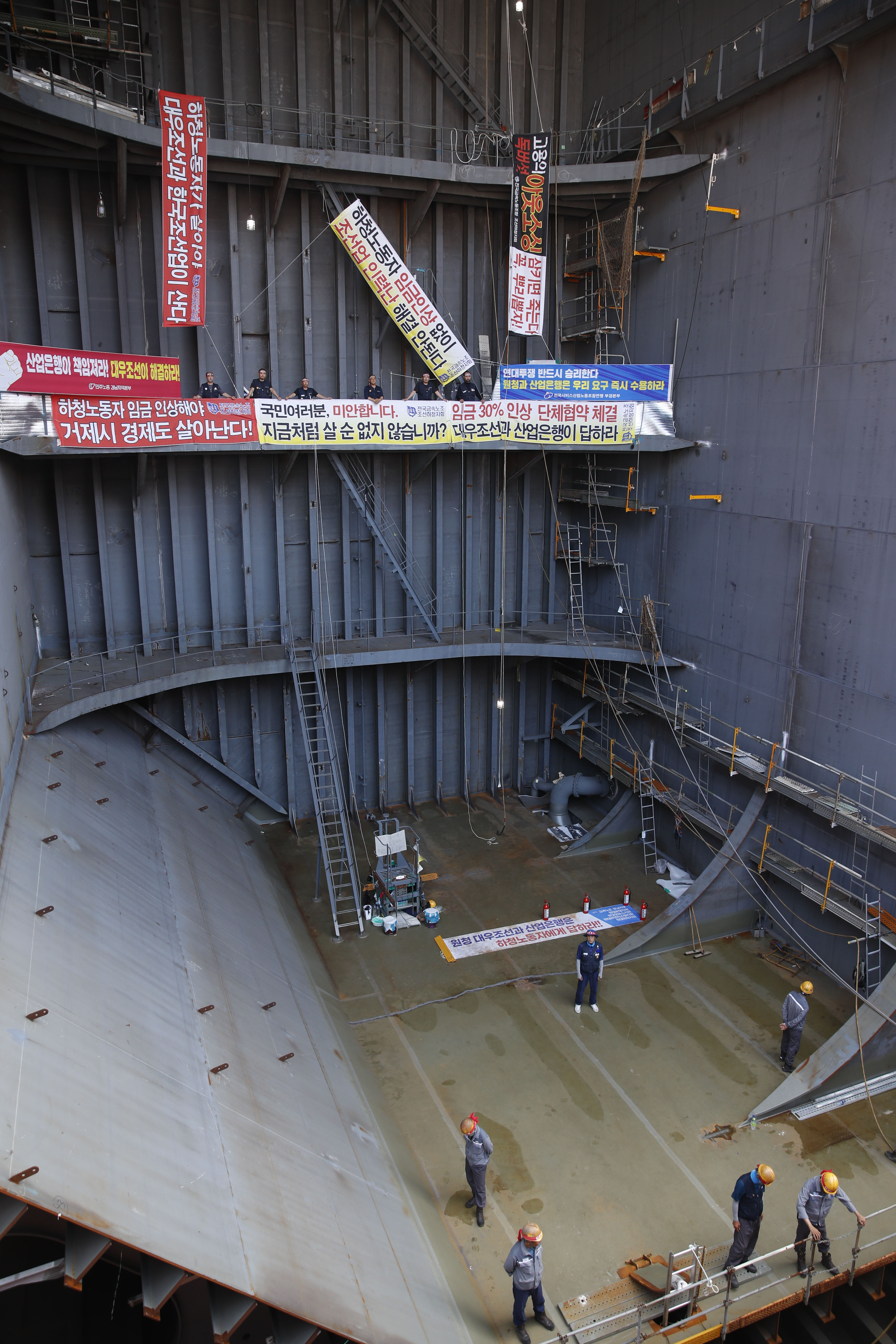 - 그러자 조선하청지회 노동자 7명은 지난달 21일 거제 대우조선해양 옥포조선소 제1도크(선박건조공간)에서 제작(건조) 중인 초대형 원유 운반선의 화물창을 점거하고 농성을 시작했어. 이 중 6명은 화물창 안 20m 높이의 난간에서 고공농성에 들어갔고, 유최안 조선하청지회 부지회장은 가로·세로·높이 1m의 철창으로 들어가 안쪽에서 용접해서 자신을 가뒀어. 유언장과 함께 시너가 든 통을 들고서. 조선업 하청노동자들이 다 만들어진 배를 물에 띄우는 것(진수)을 막아서는 강도 높은 파업을 벌인 건 이번이 처음이야.