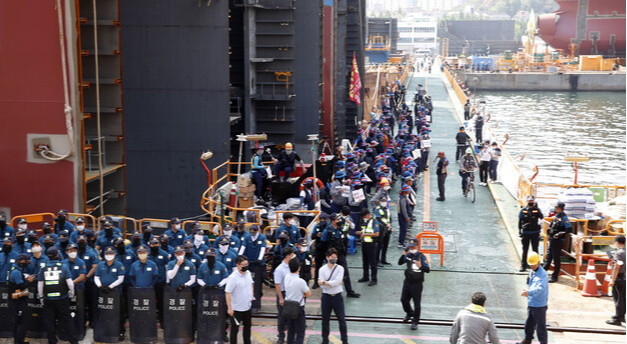 - 법에 따라 쟁의할 권리를 얻은 노조는 처음엔 조선소 안에서 투쟁을 벌였어. 하지만 회사 쪽 직원들과 물리적 충돌까지 벌어지면서 상황은 악화했어.