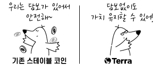 ② 테라는 가치가 일정하게 유지되는 스테이블 코인의 일종이지만, 기존 스테이블 코인들이 달러 등 실제 자산을 담보로 설정해 가치를 유지했던 것과 다른 방식 채택. 또 다른 암호화폐인 루나를 통해 가치를 유지하도록 유도하는 방식.