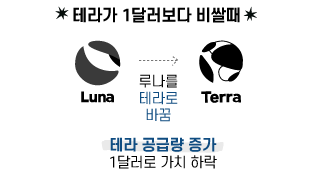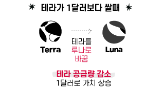 앞서 언급했듯 테라(UST)는 루나(LUNA)와 세트로 개발됐어요, 담보 대신 테라의 가치를 유지하는 게 바로 이 루나였어요, 테라는 1달러로 가격을 유지하는 코인이고, 루나는 가격이 달라지는 코인이에요. 테라와 루나는 서로 교환이 가능해요. 투자자끼리 거래하는 게 아니라, 시스템에서 바꿀 수 있어요. 테라를 루나로 바꾸면 그만큼 세상에 존재하는 테라가 줄어들고, 반대로 루나는 늘어나게 되는 식인 거죠.