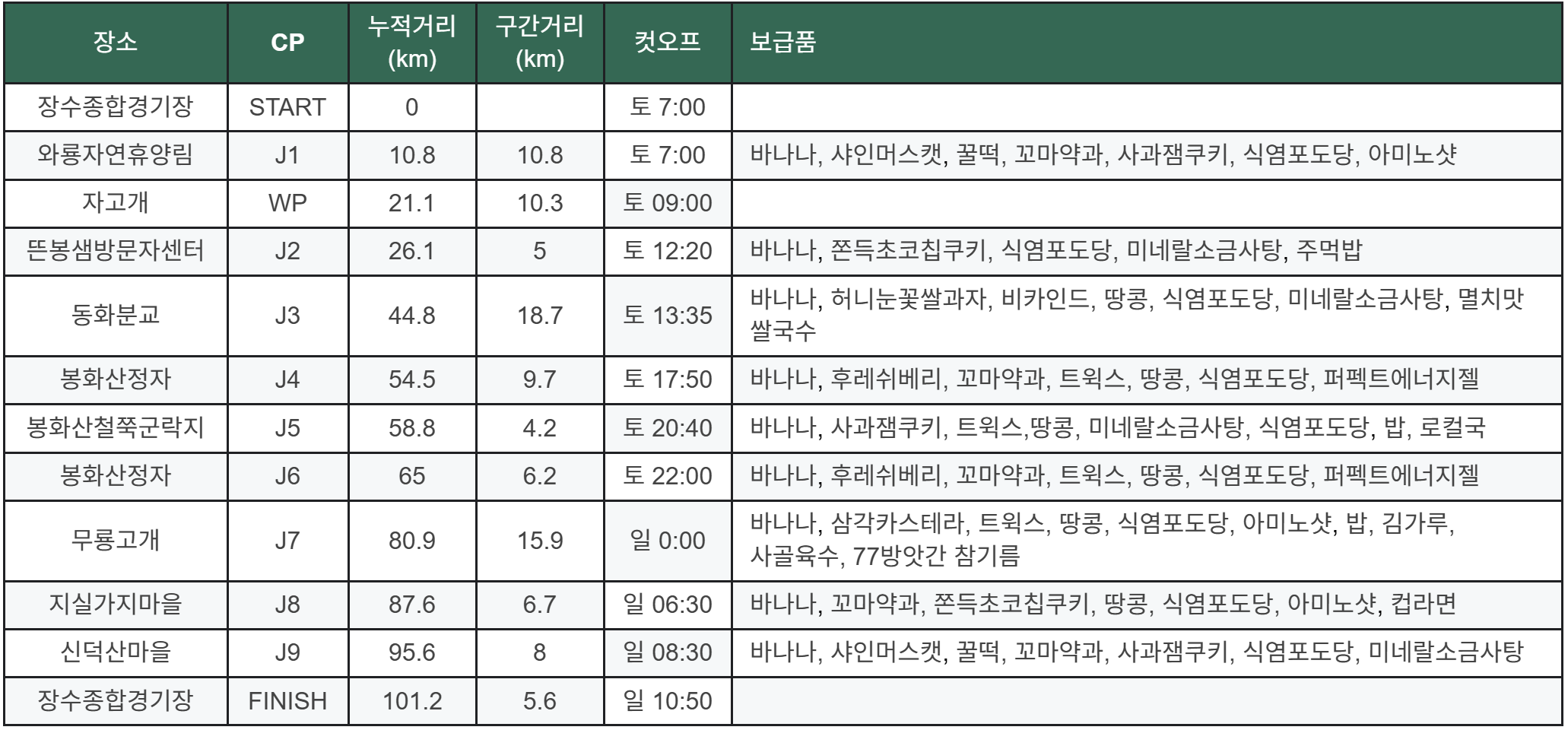 - CP마다 제공되는 보급품을 미리 확인하고 본인 컨디션에 맞춰 섭취 계획을 세우시면 완주에 큰 도움이 됩니다.