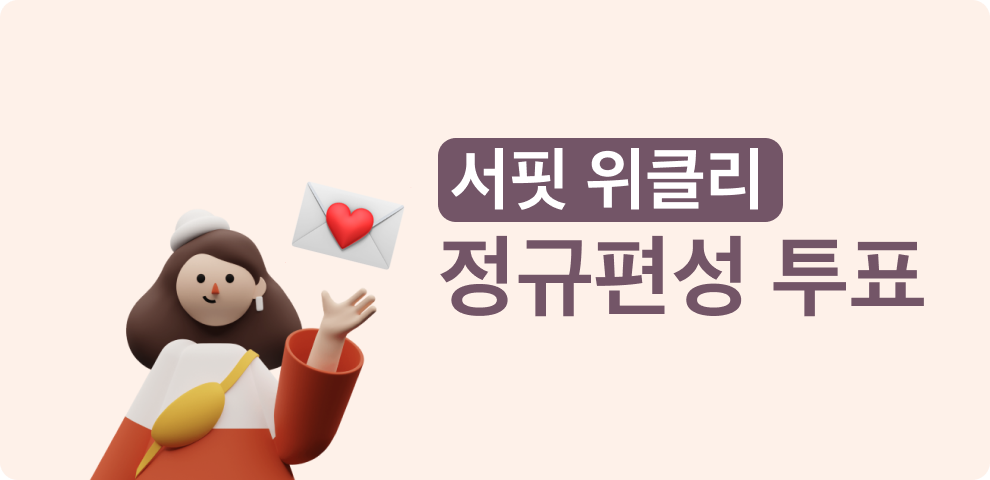 $%name%$ 서퍼님 안녕하세요❤️ 서핏 팀 강혜지입니다! 서핏 위클리가 벌써 10회를 맞이했어요🎉 서퍼님의 따뜻한 관심과 응원 덕분이에요🙇 그동안 서핏 위클리에서는 주간 인기 아티클뿐만 아니라 소소한 파일럿 코너들이 함께 했어요(ㄱ나니..?) 오늘은 10회를 맞아 그중 하나를 정규 편성하려고 합니다! 서핏 위클리 맨 마지막에 투표함을 열어두었으니 꼭! 투표하고 가세요🗳 그럼 주간 인기 아티클부터 만나볼까요? 레고레고~🏄