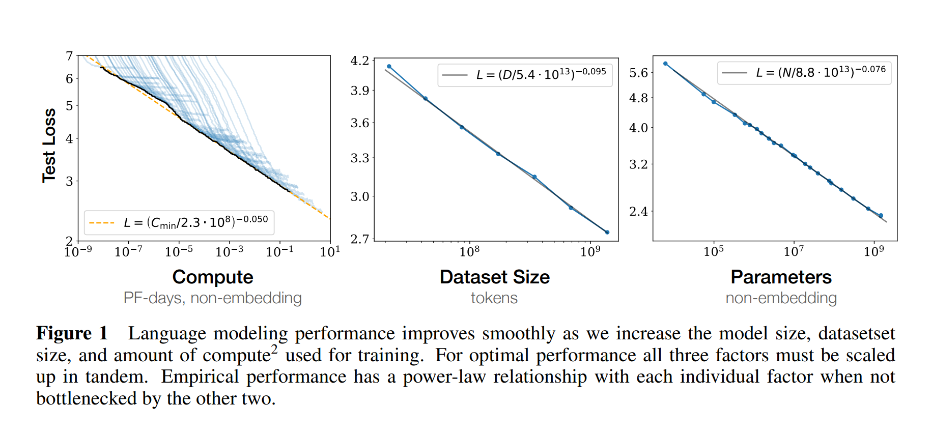 언어 모델의 성능은 모델 크기, 데이터셋 크기, 학습에 사용된 컴퓨팅 양에 대해 거듭제곱 법칙(Power Law)을 따라 향상된다.