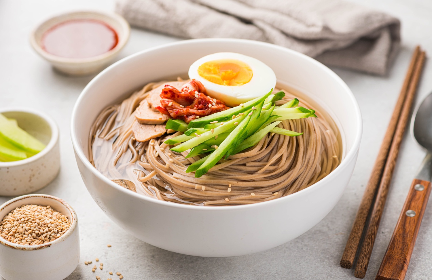 김치 한 점이면 충분해요. 어떤 김치든 괜찮지만, 잘 익은 숙성 김치라면 더없이 잘 어울려요. 막국수 특유의 담백한 맛에 깊이를 더해주고 재료 고유의 향미를 살려주는 역할도 해요.