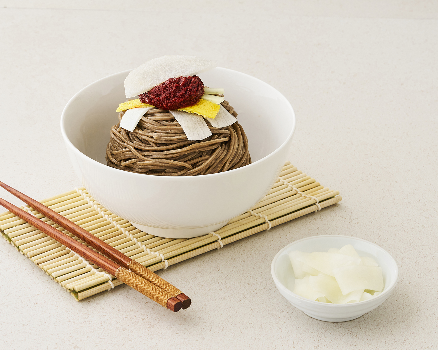 🙋 새로 출시된 막국수를 맛있게 먹는 방법이 따로 있다면 소개해 주세요. 패키지 속 초절임 무를 면 위에 국물까지 꾹 짜서 함께 드셔보셨으면 해요. 그 국물이 면과 어우러졌을 때 매장에서 드시는 맛에 가까워지거든요. 자극적인 간을 더한다기보다 국물에 은근한 깊이를 더해주는 요소예요. 말하자면, 작지만 중요한 한 방울이라고 할까요.