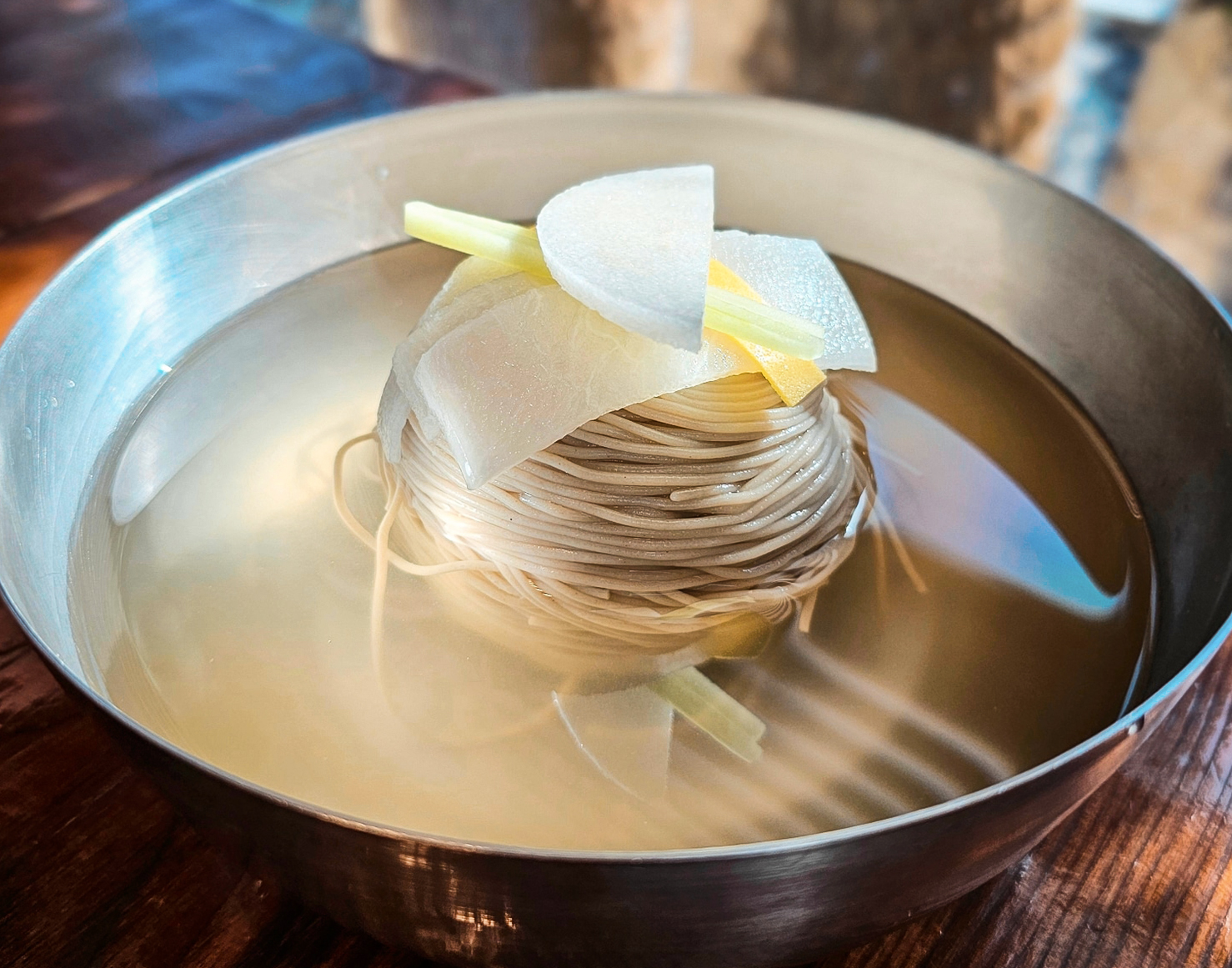 그리고 보통 테이블 위에 식초나 겨자를 올려두고 손님이 취향껏 간을 조절하도록 하잖아요. 하지만 그렇게 되면 같은 테이블에서도 전혀 다른 맛을 느끼게 돼요. 그래서 저희는 테이블 위에 다른 건 따로 두지 않아요. 막국수는 주방에서 이미 완성된 음식이니까요. 젓가락을 들면 가장 맛있는 상태로 드실 수 있도록 설계했죠. |
