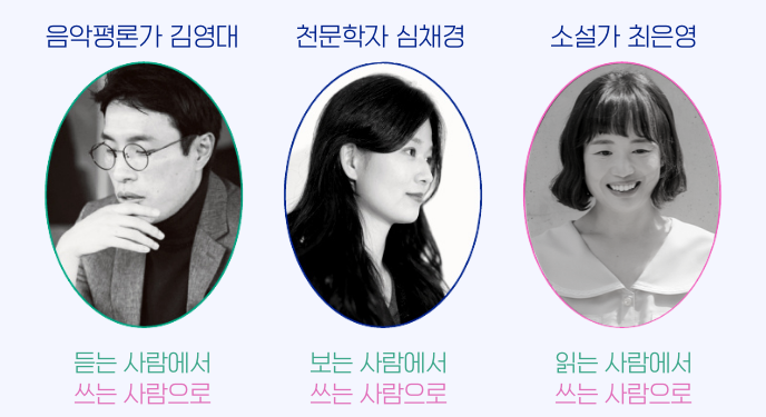 '____ 사람에서, 쓰는 사람으로' 작가들은 쓰기 이전에 어떤 사람이었을까요? 김영대 작가는 음악을 듣는 사람에서, 심채경 작가는 우주를 보는 사람에서, 최은영 작가는 소설을 읽는 사람에서 쓰는 사람이 되었습니다. 작가들은 각자의 책에서 쓰는 사람만이 발견할 수 있는 세상의 이면을 소개해드립니다. 🏸 작가 탐구하기 음악평론가 김영대 『지금 여기의 아이돌-아티스트』 케이팝 전문가가 바라본 아이돌 음악의 특별한 세계 "나는 이 책에서 현재 한국 제도권 대중음악 신에서 유의미한 궤적을 그리고 있는 열 팀의 아이돌과 그들의 음악을 평가하고자 한다. 익히 알려졌거나 아직은 대중에게 낯선 이들의 음악과 퍼포먼스를 들여다봄으로써 그 안에 담긴 예술적, 미학적 매력과 가치를 발견해내는 것이 이 책의 가장 중요한 부분이 될 것이다. 나는 굳이 역사상 가장 위대한 케이팝 아이돌이 아닌 ‘지금 여기의’ 아이돌만을 따로 다루고자 하는데, 바로 지금 우리가 각각의 이유로 주목해야만 하는 아티스트들을 통해 역사 속의 케이팝이 아닌 지금 막 벌어지고 있는 케이팝 산업 전반의 여러 면모를 조금 더 역동적으로 들여다볼 수 있다고 믿기 때문이다." 『지금 여기 아이돌 - 아티스트』 프롤로그에서 천문학자 심채경 『천문학자는 별을 보지 않는다』 천문학자가 들려주는 우주를 사랑하는 만 가지 방법 "그런 사람들이 좋았다. 남들이 보기엔 저게 대체 뭘까 싶은 것에 즐겁게 몰두하는 사람들. 남에게 해를 끼치거나 정치적 싸움을 만들어내지도 않을, 대단한 명예나 부가 따라오는 것도 아니요, 텔레비전이나 휴대전화처럼 보편적인 삶의 방식을 바꿔놓을 영향력을 지닌 것도 아닌 그런 일에 열정을 바치는 사람들. 신호가 도달하는 데만 수백 년 걸릴 곳에 하염없이 전파를 흘려보내며 온 우주에 과연 ‘우리뿐인가’를 깊이 생각하는 무해한 사람들. 나는 그런 사람들을 동경한다. 그리고 그들이 동경하는 하늘을, 자연을, 우주를 함께 동경한다." 『천문학자는 별을 보지 않는다』 프롤로그에서 소설가 최은영 『쇼코의 미소』 『내게 무해한 사람』 『밝은 밤』 사람과 삶을 향한 단단하고 부드러운 시선 "마음이라는 것이 꺼내볼 수 있는 몸속 장기라면, 가끔 가슴에 손을 넣어 꺼내서 따뜻한 물로 씻어주고 싶었다. 깨끗하게 씻어서 수건으로 물기를 닦고 해가 잘 들고 바람이 잘 통하는 곳에 널어놓고 싶었다. 그러는 동안 나는 마음이 없는 사람으로 살고, 마음이 햇볕에 잘 마르면 부드럽고 좋은 향기가 나는 마음을 다시 가슴에 넣고 새롭게 시작할 수 있겠지." 『밝은 밤』 본문에서