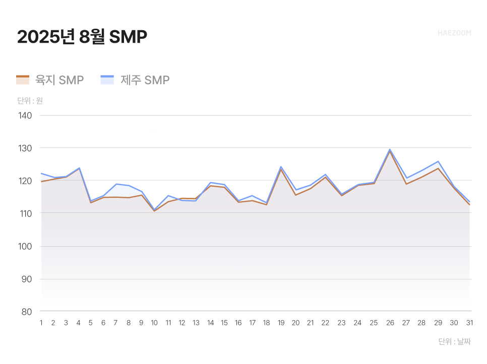 제주 8월 SMP 평균 가격은 2.61원 하락하며 118.41원을 기록했습니다.