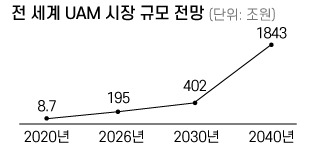 ③ 전 세계 UAM 시장은 20년 동안 약 200배 성장할 것으로 전망됐을 만큼 유망함. 한국은 정부와 민간 기업, 공공기관이 협업하기 위한 'UAM 팀코리아'를 결성하고 상용화를 준비하고 있음. 2035년쯤엔 필수적인 대중 교통수단으로 자리 잡을 수 있다는 전망도 내놨음.