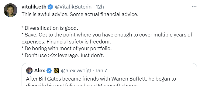 - 비탈릭 부테린은 "이는 끔찍한 조언이다" 라며 "다각화는 좋다. 포트폴리오를 지루하게 만들어라. 2배 이상의 레버리지를 사용하지 마라" 라고 투자 조언을 남김
