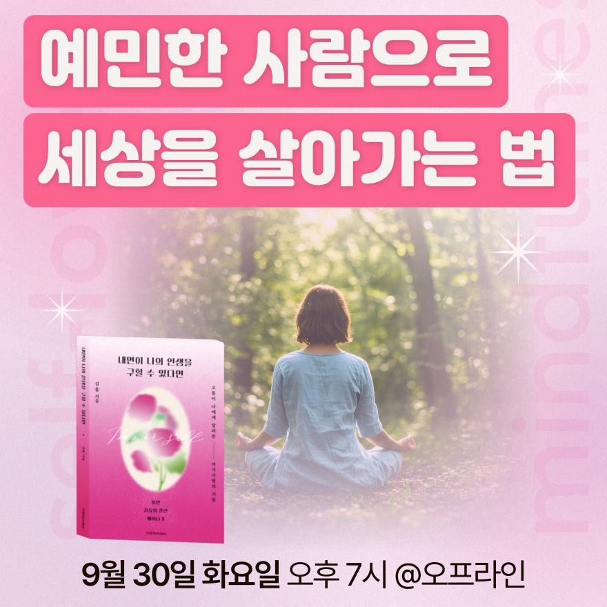 작은 일에도 짜증이 나고, 다른 사람들보다 감정적이지만 억지로 괜찮은 척 하며 내 마음의 신호를 외면하고 있을 지도 몰라요. 9월 마음클럽에서는 『내면이 나의 인생을 구할 수 있다면』 저자 김율 명상안내자와 함께 마음챙김 명상을 통해 예민함을 삶의 무기로 바꾸는 법에 대해서 알아보겠습니다.