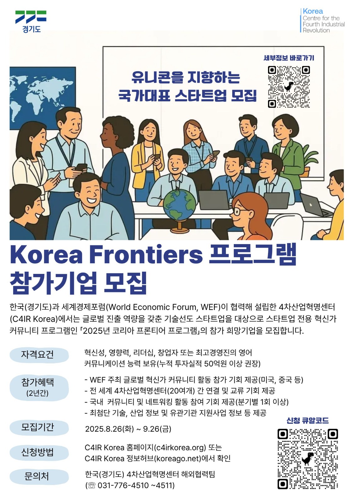 경기도와 세계경제포럼이 협력해 설립한 4차산업혁명센터에서 글로벌 진출 역량을 갖춘 기술선도기업을 대상으로 스타트업 전용 혁신가 커뮤니티 프로그램인 2025 Korea Frontiers 프로그램의 참가기업을 모집합니다.
