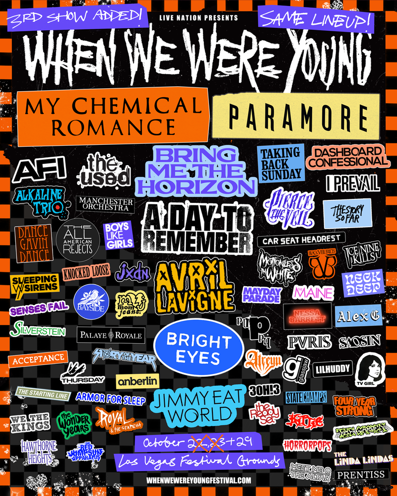 ํํํฌ์ ์ธ๊ธฐ๊ฐ ์ฌ์์น ์๋ค. ์์ ์ปจํธ๋กค ๋งค๊ฑฐ์ง์์๋ ์ด์ ๋ํ ์นผ๋ผ(๊ด๋ จ ๊ธฐ์ฌ: ๋ค์ ํซํด์ง POP PUNK์ ๋ํด ์์๋ณด์)์ ๋ค๋ฃฌ ์ ์ด ์์ง๋ง ์ง๊ธ์ ๊ทธ ๊ธฐ์ธ๊ฐ ๋ ๊ฑฐ์ธ์ง ๋ถ์๊ธฐ์ด๋ค. ์ผ๋ก๋ก ๋ง์ด ์ผ๋ฏธ์ปฌ ๋ก๋งจ์ค(My Chemical Romance)์ ํ๋ผ๋ชจ์ด(Paramore)๋ฅผ ํค๋๋ผ์ด๋๋ก ์์ธ์ด ์ด๋ชจ-ํํํฌ ํ์คํฐ๋ฒ์ธ 'When We Were Young Festival'์ ๋น์ด 10์ 22์ผ 1ํ ๊ณต์ฐ์ผ๋ก ๊ณํ๋์ง๋ง ์์๊ฐ์ ๋งค์ง์ ๊ธฐ๋กํ๊ณ , ์ฃผ์ต ์ธก์ ์ผ์ฃผ์ผ๋ง์ 23์ผ๊ณผ 29์ผ ๋์ผ ๋ผ์ธ์