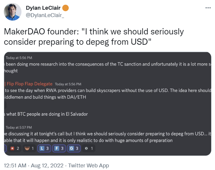 메이커다오(MakerDAO)의 창립자가 룬 크리텐슨은 "진지하게 USD로부터 디페깅하는 것을 생각해 봐야 한다"라고 밝히며 약 35억 달러어치의 USDC로 ETH를 구매할 것이라는 소문이 돌고 있습니다. 최근 USDC의 발행사 써클이 미국 재무부와 협력하여 토네이도 캐시를 사용한 주소의 USDC를 동결하는 조치를 취했는데, 이에 대한 반작용으로 디파이 업계에서 탈중앙화된 스테이블코인이 필요하다는 인식이 자리 잡고 있는 모양새입니다. 하지만 일각에서는 USDC로 ETH를 구매하는 것이 과거 테라가 BTC를 구매한 것과 같다는 비유로 비꼬기도 했는데요, 탈중앙화된 스테이블코인에 대한 수요가 커진 상황에서 디파이 시장은 어떻게 반응할지 그 귀추가 주목됩니다. |