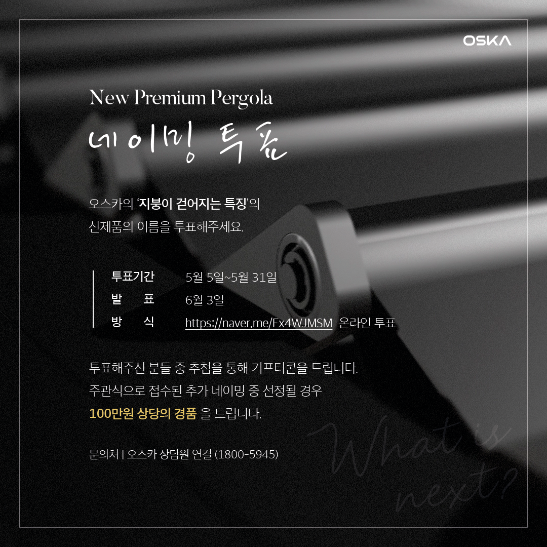 이렇게 오스카의 신제품 네이밍 공모전 중간 집계에 대해 보여드렸는데요. 다음 주 5월 31일까지 투표가 진행되니 아직 오스카의 신제품명 투표에 참가하지 않으셨다면 아래 버튼을 눌러 투표하실 수 있습니다. 남은 기간에도 고객님들의 많은 투표와 관심 부탁드립니다. 최종 발표는 6월 3일 공식 홈페이지 및 블로그에서 확인하실 수 있습니다 :-)