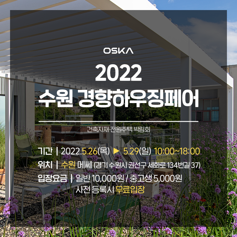 앞서 안내드린 것과 같이 이번주 목요일부터 일요일까지 수원 경향하우징페어에 참가하여 고객님들을 만나뵐 예정입니다. 오스카의 전 라인업! 수동형파고라 STAY 스테이, 전동형 파고라 AIREA 에어리어, 프리미엄 전동형 파고라 OPERA 오페라를 만나보실 수 있습니다. 많은 방문 부탁드립니다 🙌